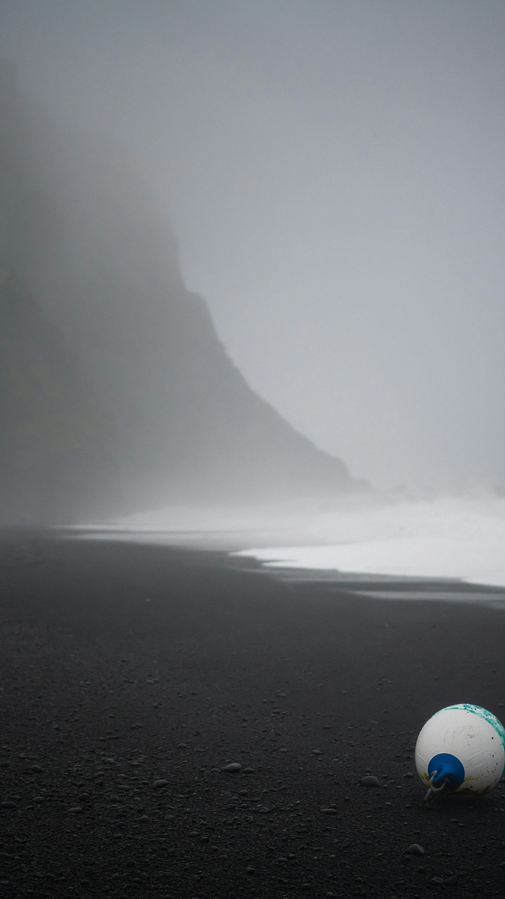 beach ball, ball, beach, fog, misty, hazy, ocean, seashore, coast, sand, water, mist, seascape, landscape, foggy beach, sphere, round, seaside, shore, coastal