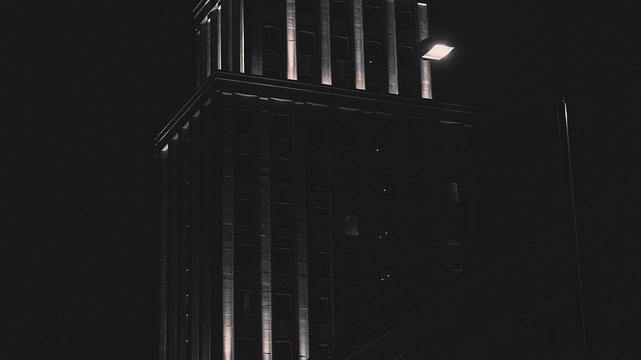 The nighttime setting adds a layer of mystery and intrigue, highlighting the building’s silhouette against the dark sky. The shadows cast by the building create depth and texture, enhancing the overall visual impact. This wallpaper is perfect for those who appreciate cityscapes, urban photography, and architectural details.