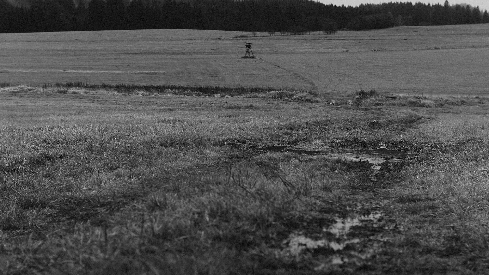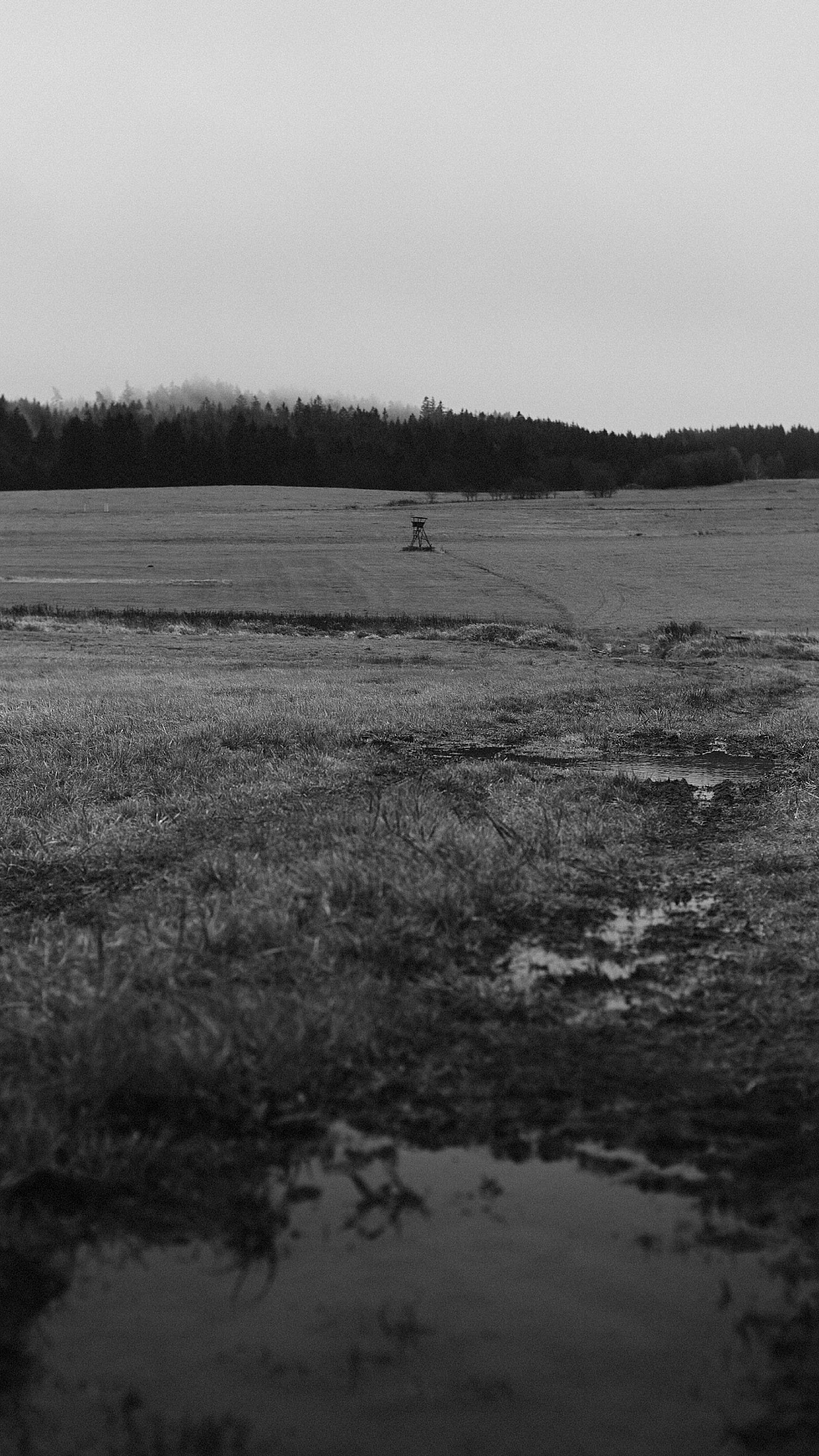 Keywords: black and white, monochrome, field, puddle, water, reflection, nature, landscape, rural, countryside, outdoor, photography, still, serene, calm