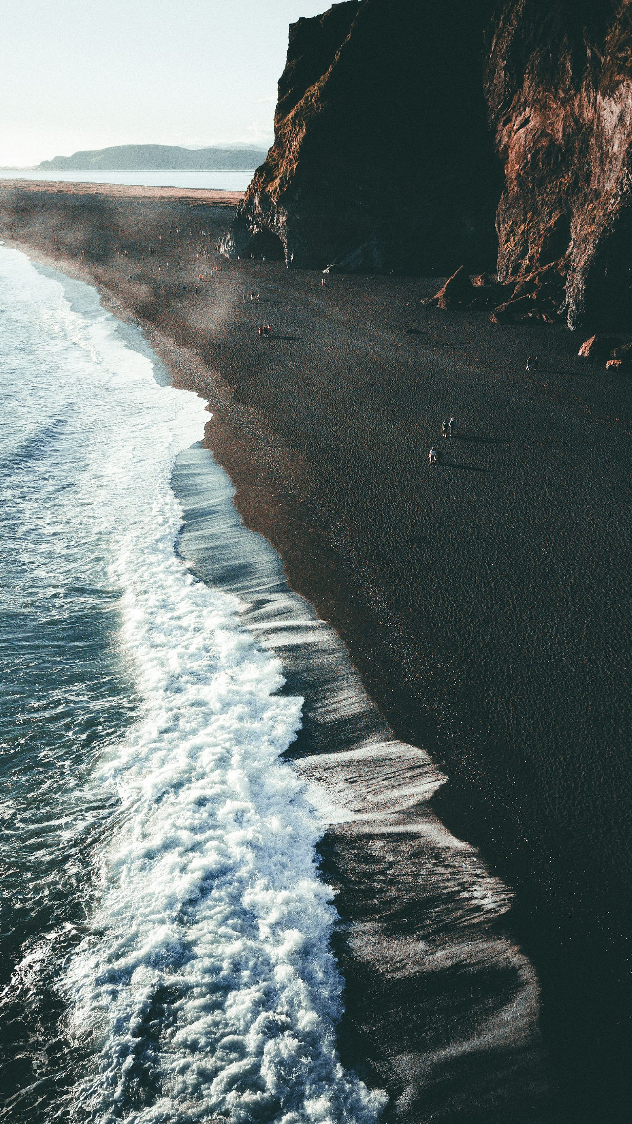 black beach, waves, ocean, sea, shore, coastline, dark sand, volcanic beach, water, nature, landscape, seascape, beach scene, dark, dramatic