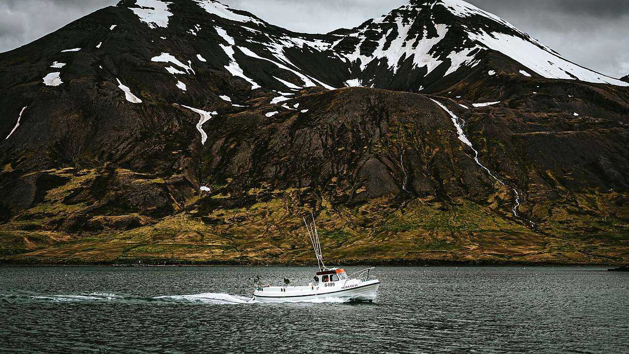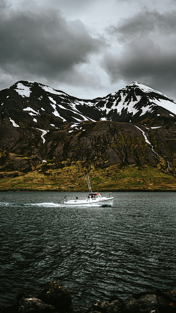 Keywords: boat, water, mountain, landscape, scenery, nature, calm, peaceful, serene, tranquil, ocean, lake, river, sea, background