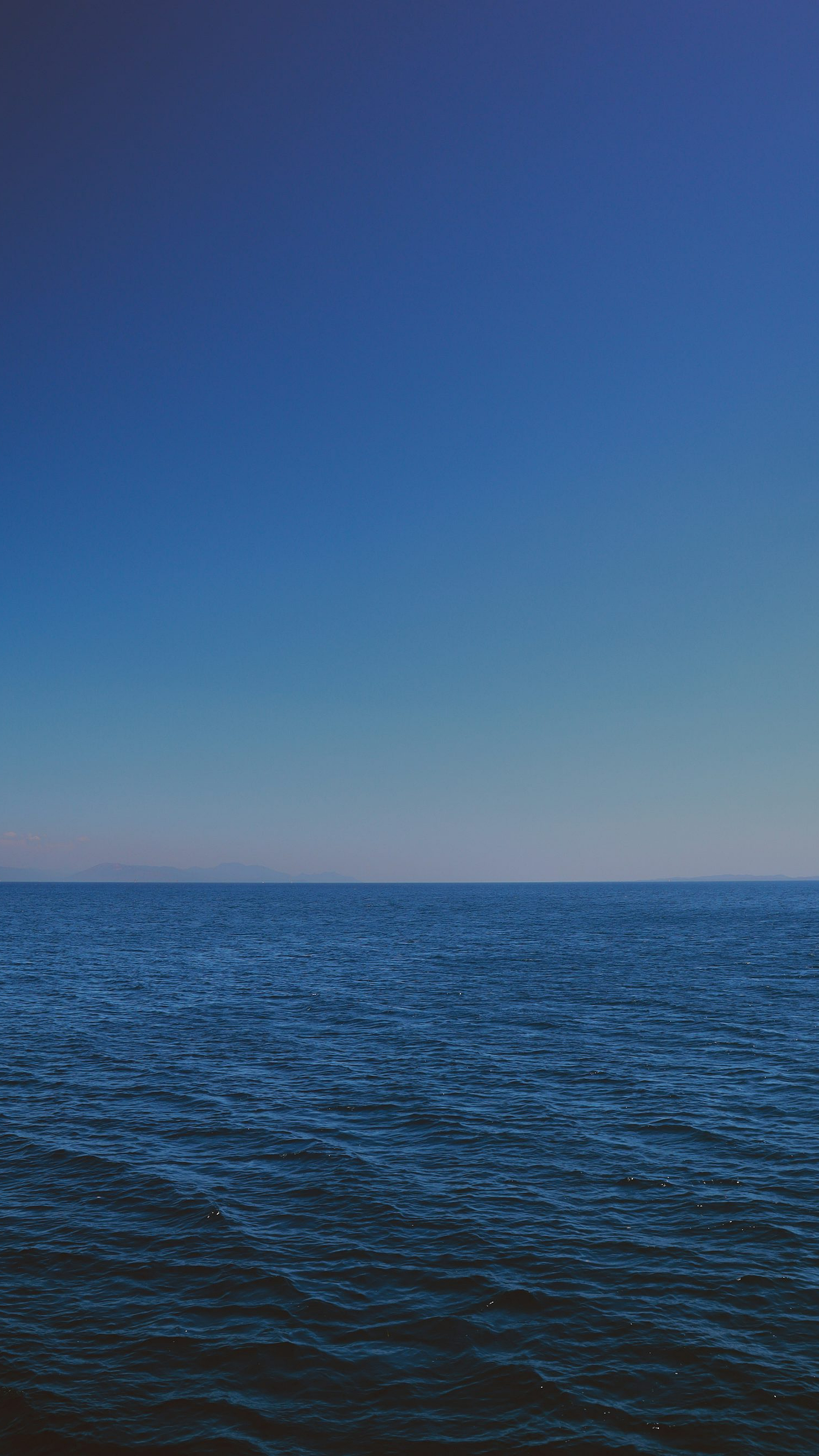 This wallpaper features a stunning body of water under a vibrant blue sky. The image evokes a sense of tranquility and peace, making it perfect for a calming desktop or mobile background. The horizon where the water meets the sky creates a beautiful contrast of colors and textures.