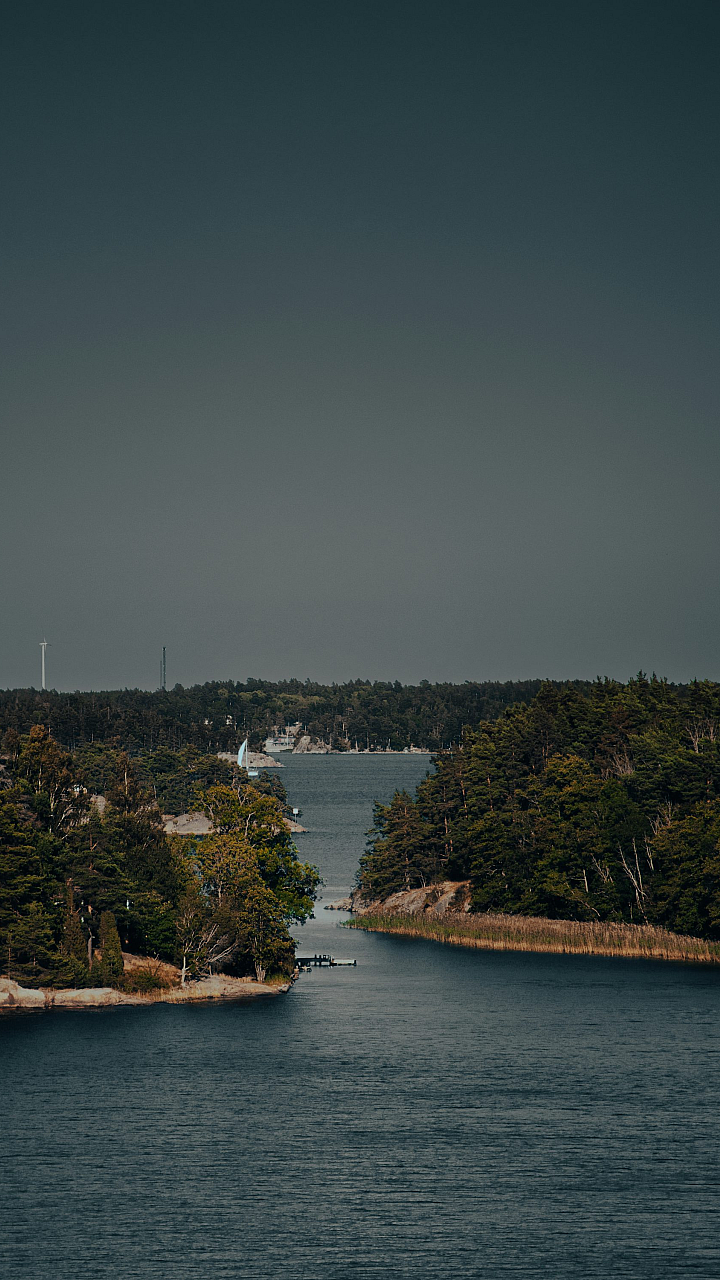 This wallpaper showcases a serene and picturesque scene featuring a body of water, whether it be a lake, river, or ocean, surrounded by lush trees and a stretch of land. The image likely captures the beauty of nature, presenting a calming and visually appealing backdrop for your device.