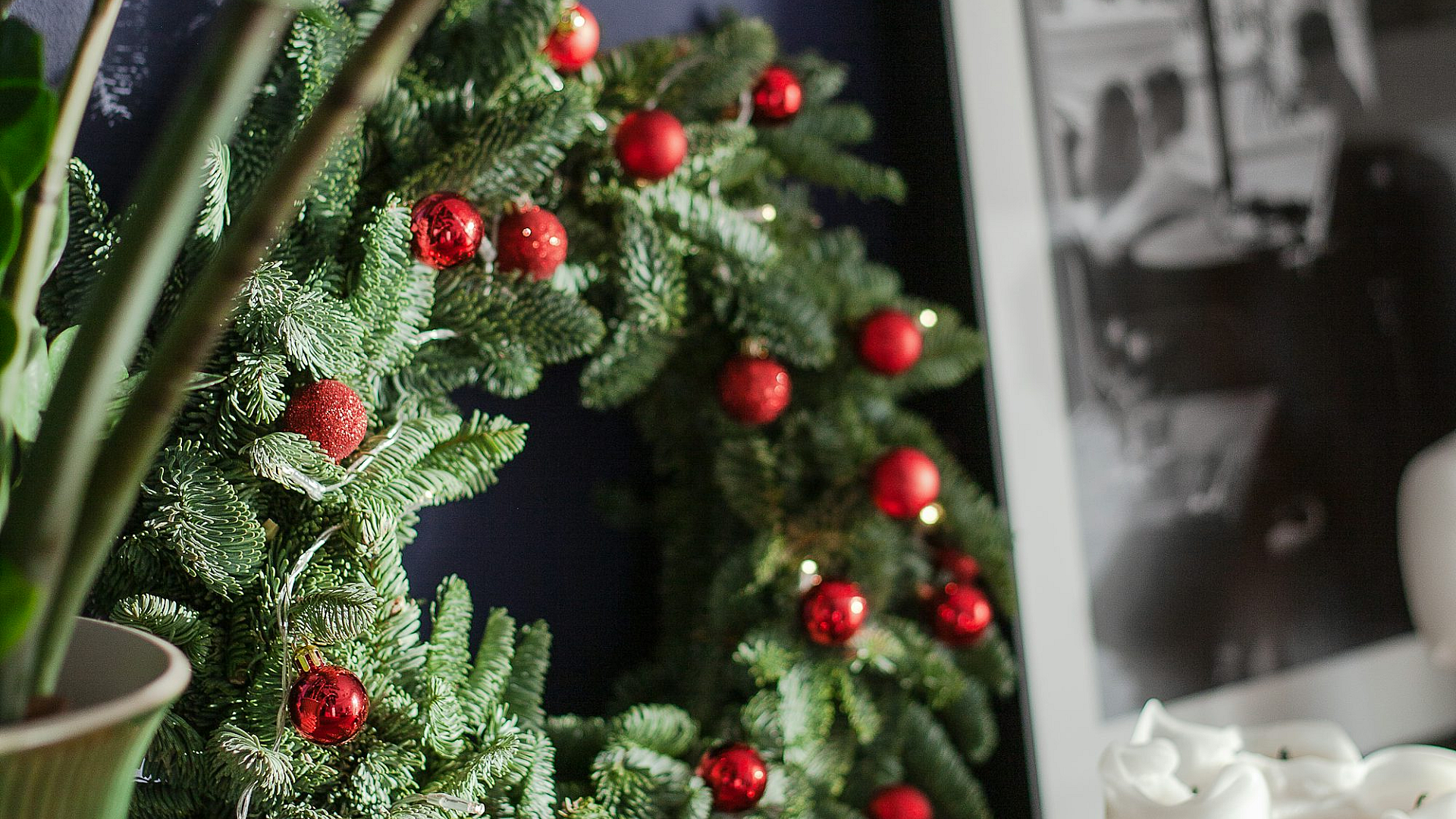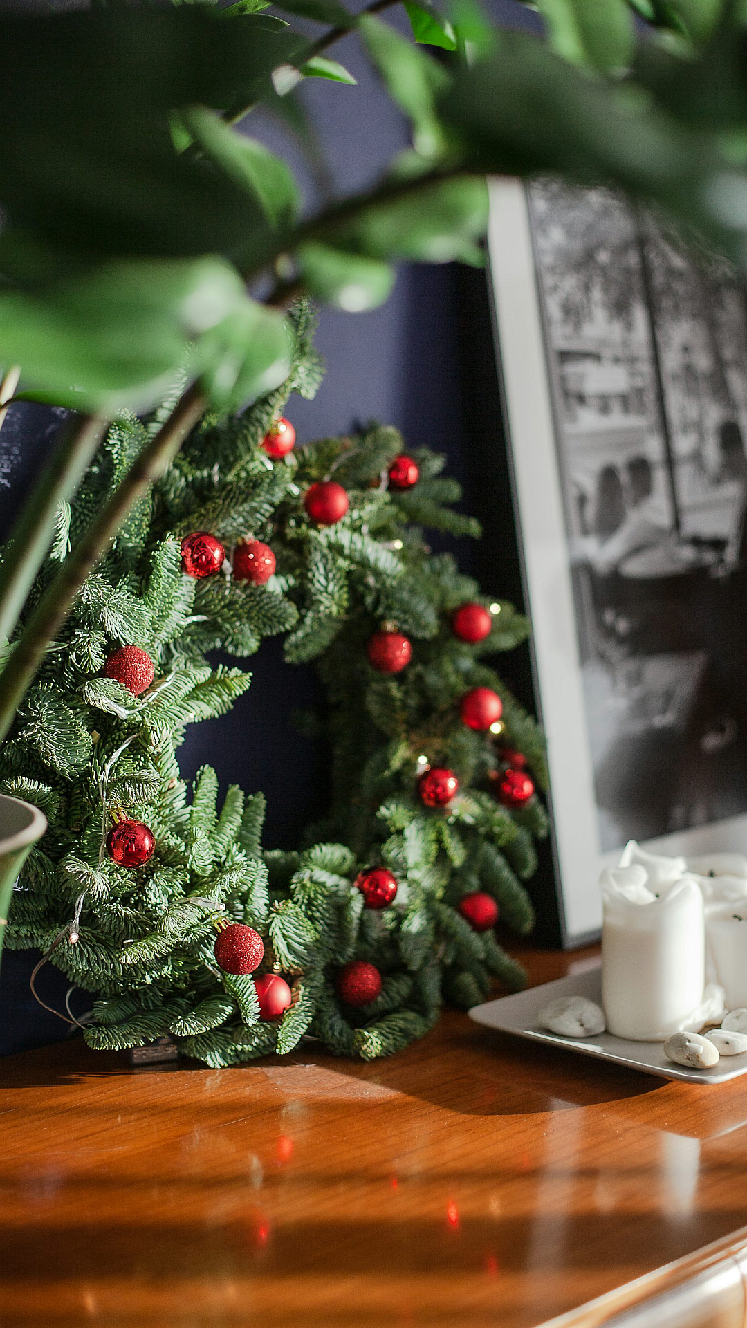 This stunning wallpaper features a Christmas wreath elegantly placed on a wooden table, next to a vibrant potted plant. The scene evokes a sense of warmth and festive cheer, perfect for setting a holiday mood. The rich colors and textures of the wreath, complemented by the lush greenery of the plant, create a visually appealing and inviting atmosphere.