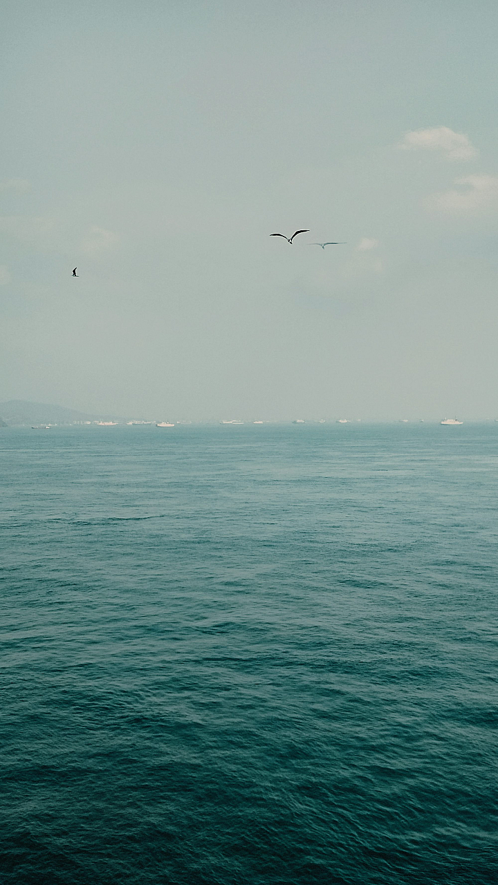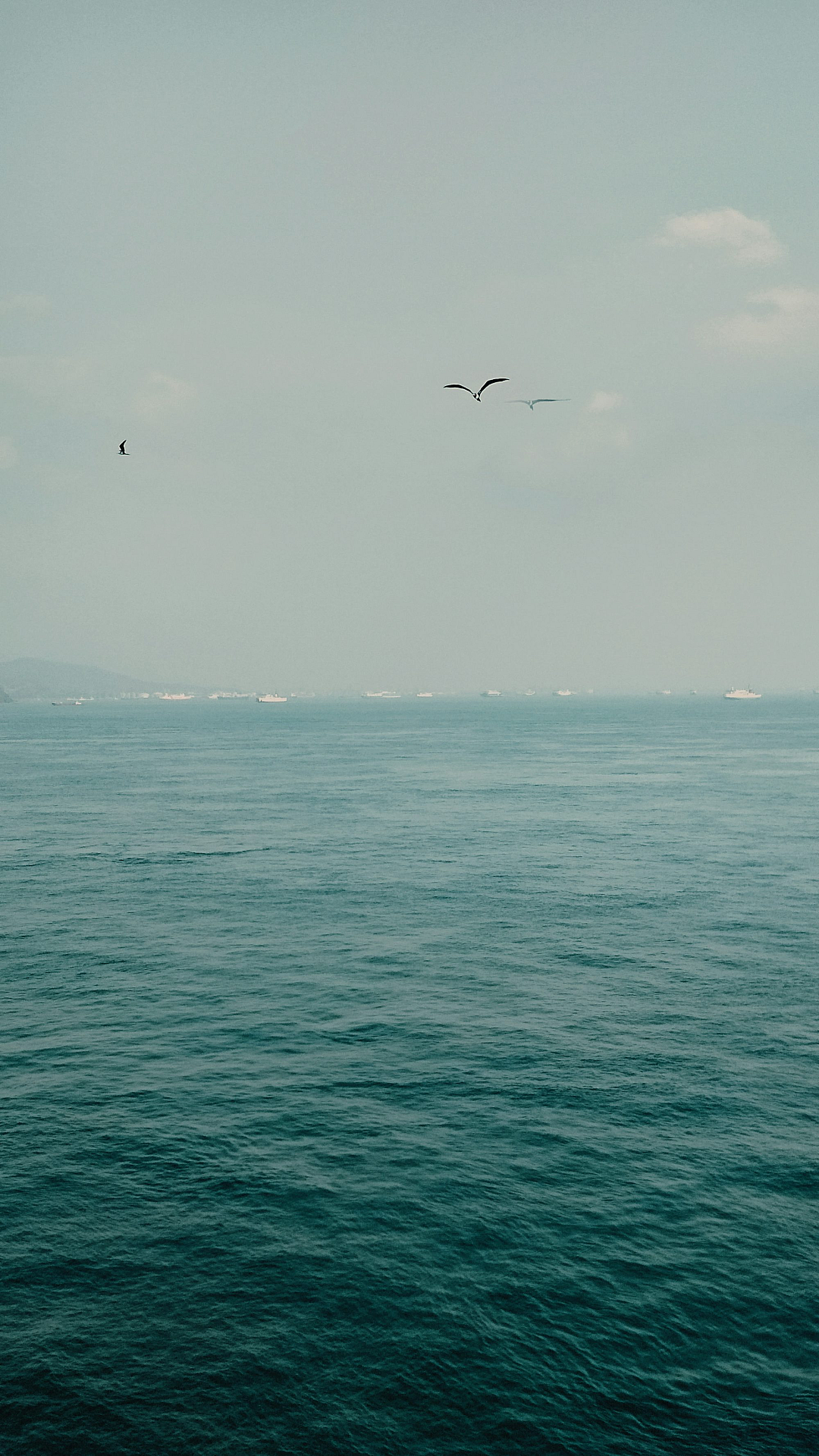 birds, flying, water, couple, ocean, lake, sea, birds in flight, aerial view, wildlife, nature, sky, clouds, landscape, two birds
