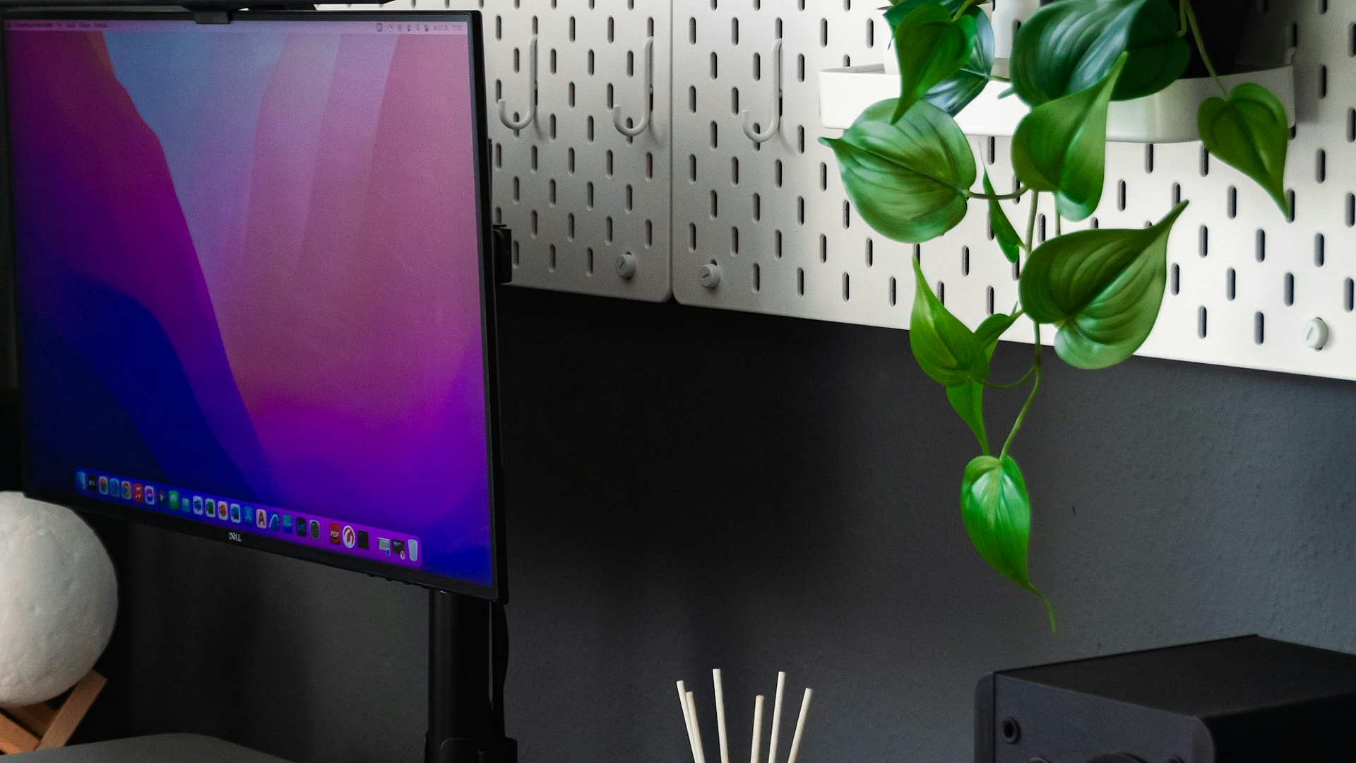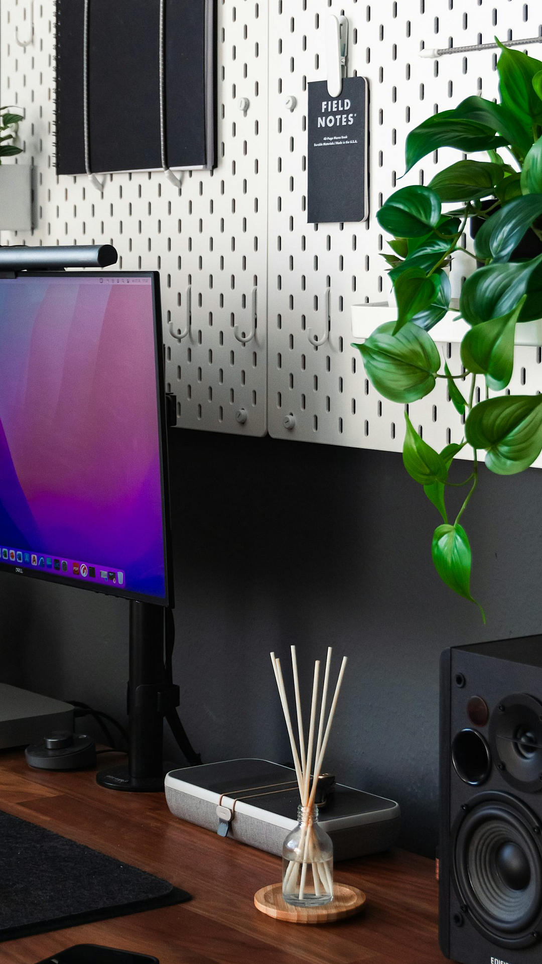 This wallpaper features a clean and organized desk setup with a computer and speakers. The image is perfect for those looking for a minimalist, modern, and productive workspace aesthetic. The focus is on the technology and the calming organization of the workspace.