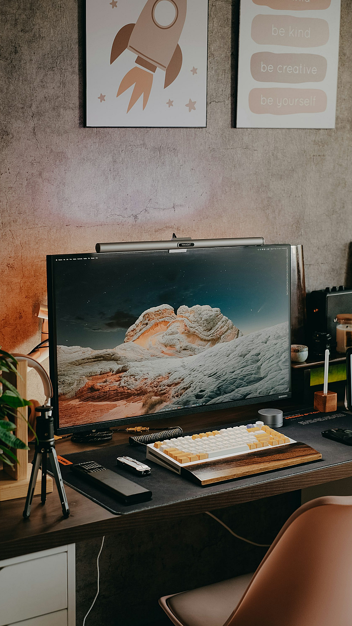 Keywords: computer desk, workspace, office setup, monitor, keyboard, mouse, desktop, computer, technology, digital, workstation, home office, setup, background, wallpaper, screen