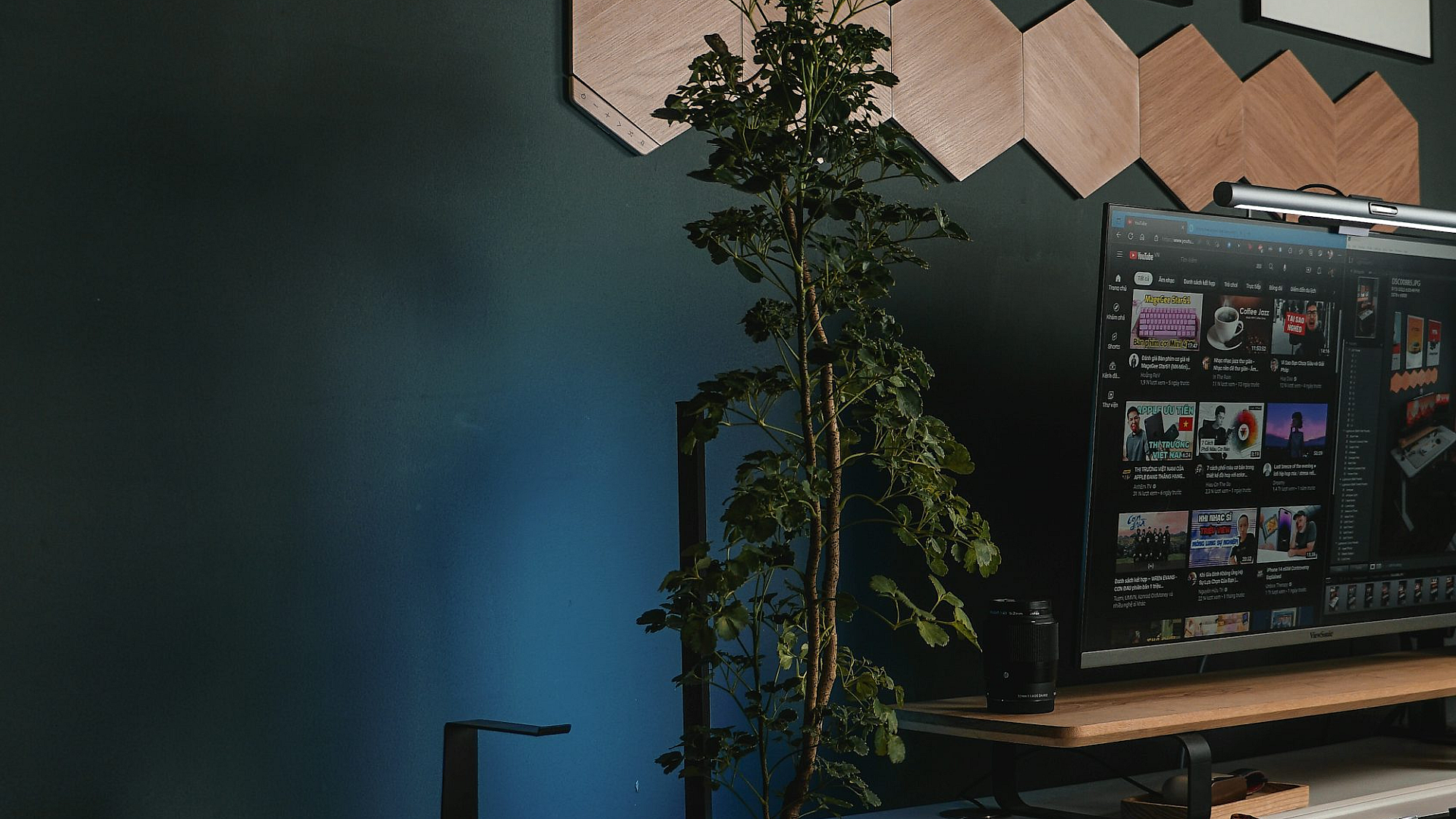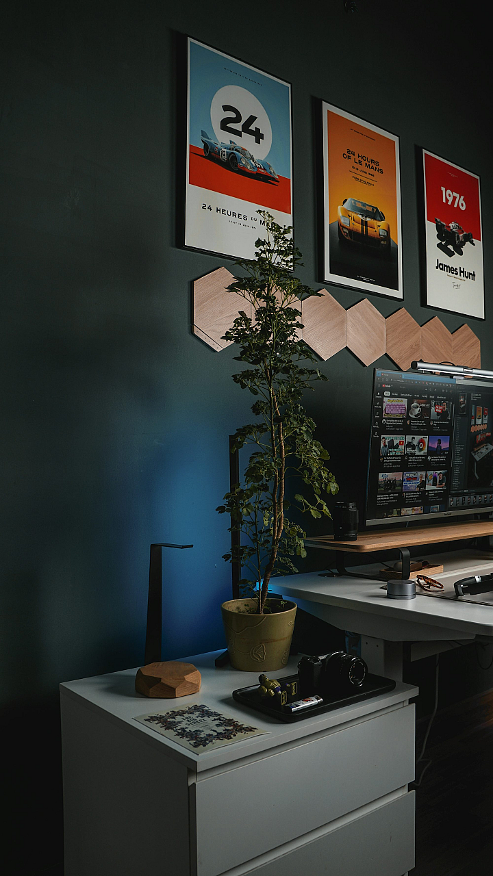desk, plant, posters, wallpaper, study, office, workspace, home office, indoor plants, decor, decoration, aesthetic, minimalist, modern, background