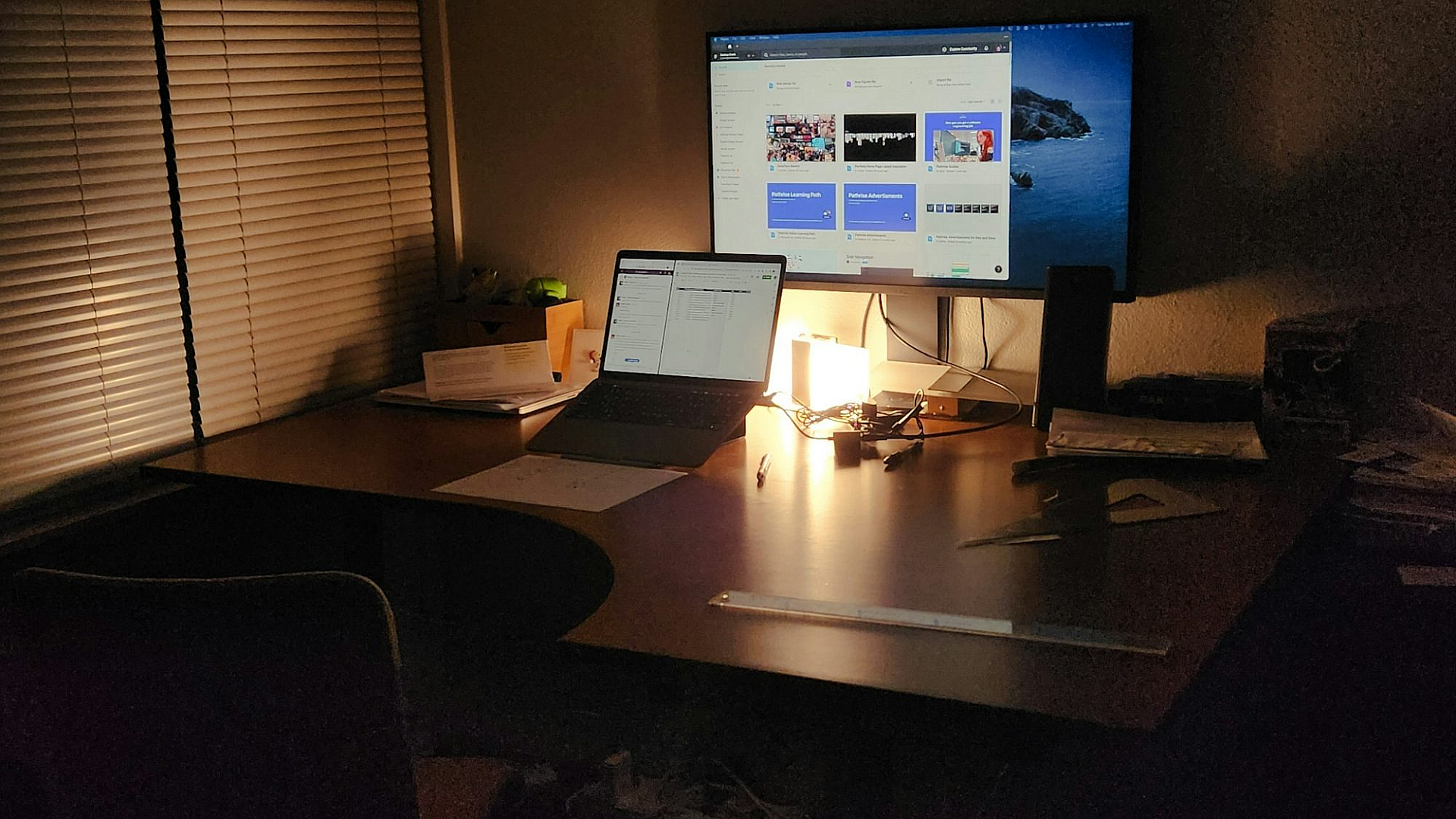 dimly lit, desk, laptop, monitor, computer, workstation, office, technology, dark, shadows, moody, ambient lighting, low light, nighttime, productivity