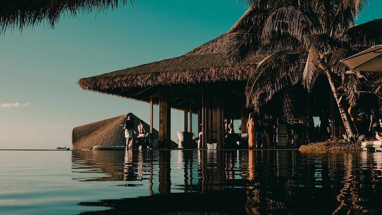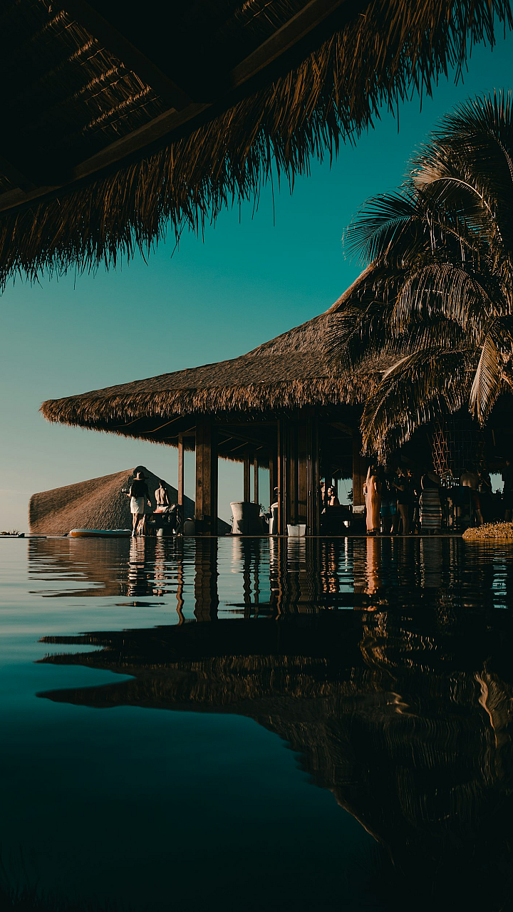 beach, hut, people, group, ocean, sea, shore, coast, sand, water, sunset, sunrise, landscape, tropical, vacation