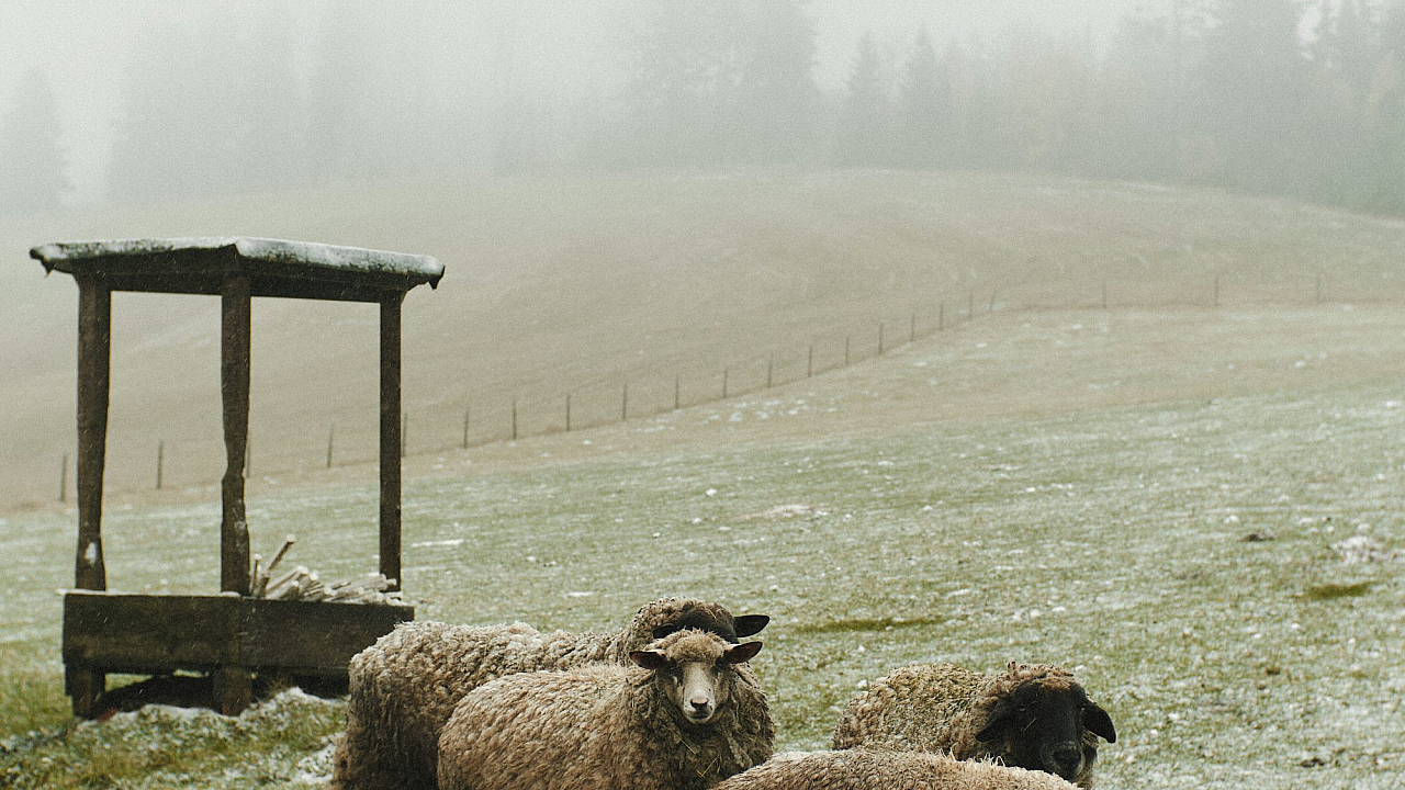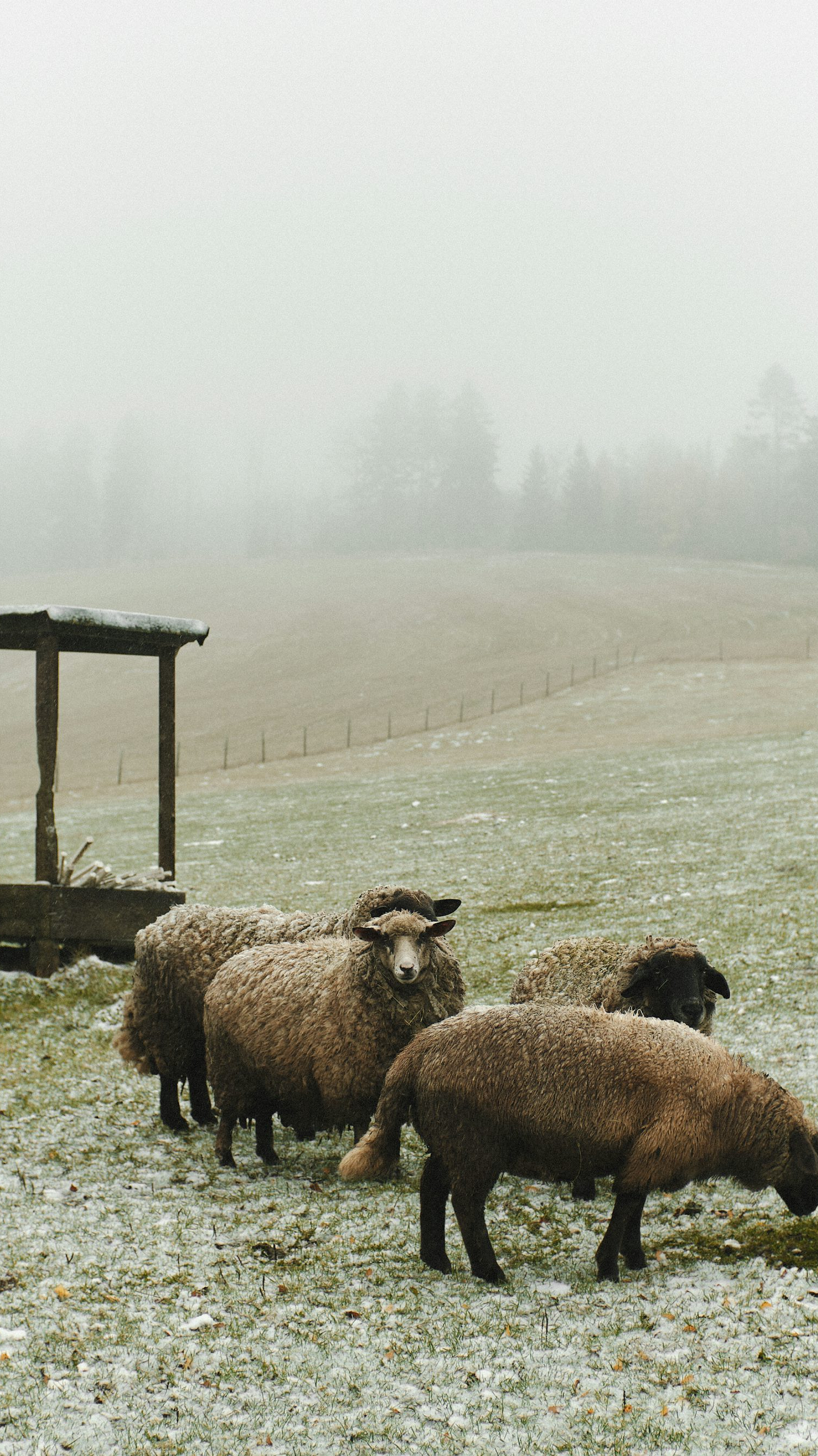 sheep, flock, herd, snow, field, winter, landscape, animals, farm animals, white, fluffy, snowy field, pastoral, countryside, wool