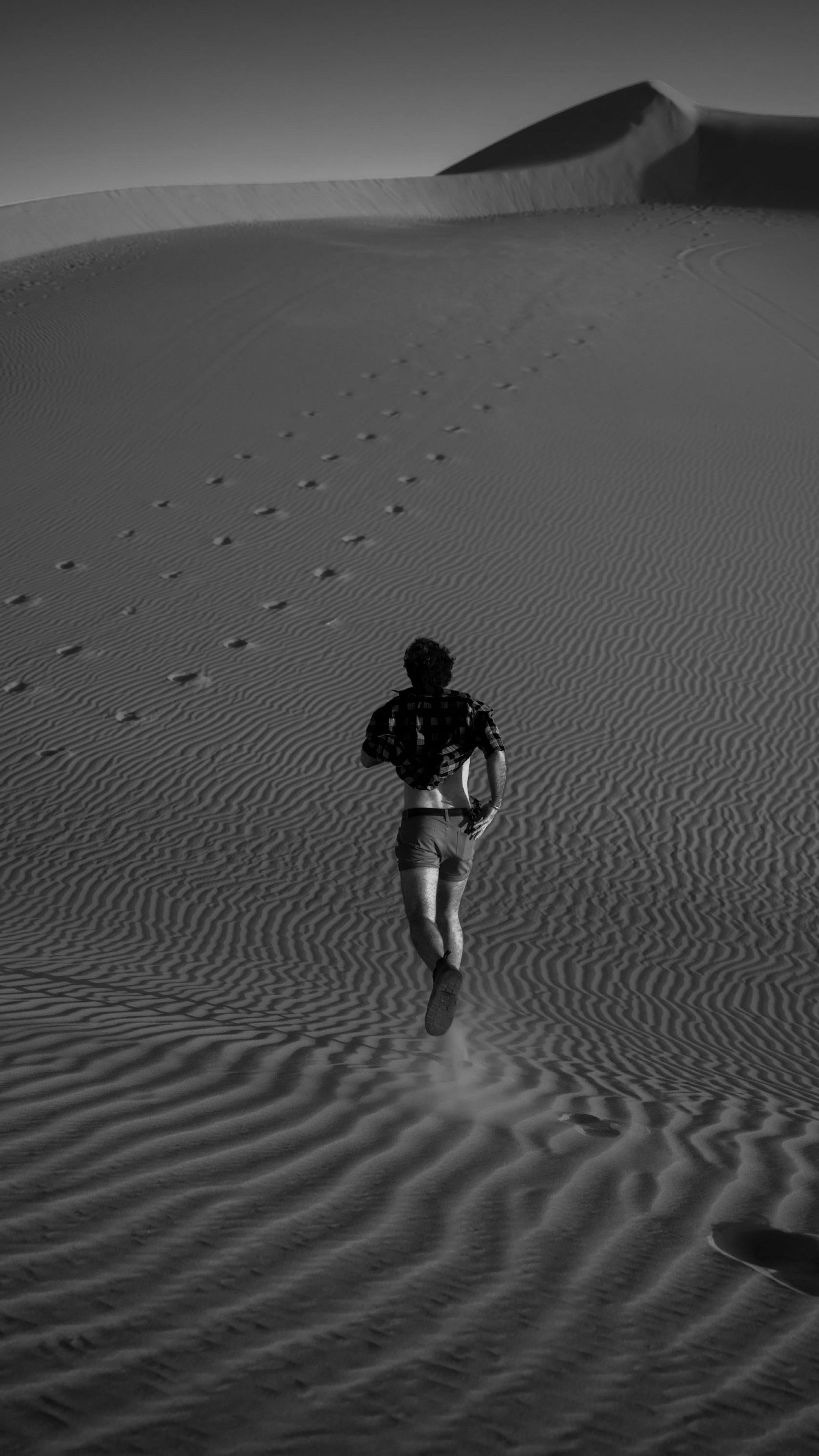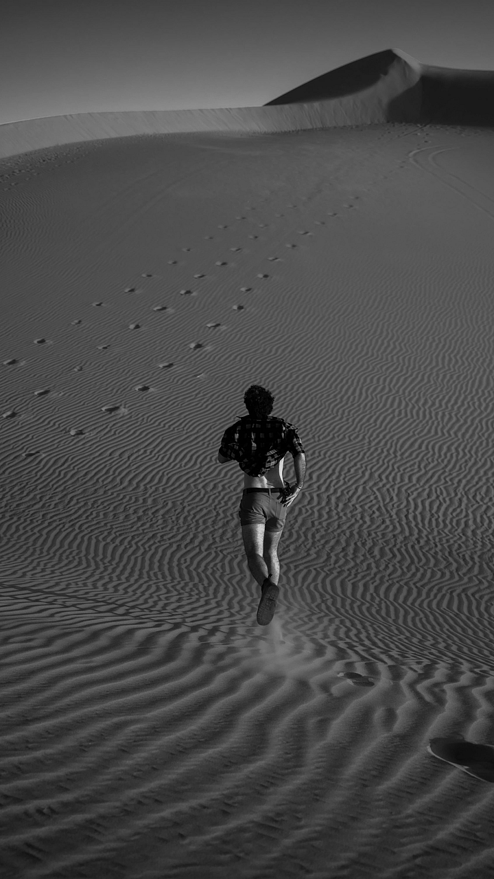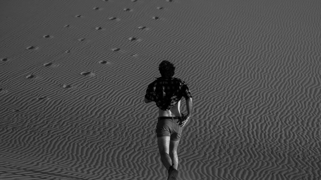 man, walking, sand, sandy field, beach, desert, footprints, tracks, steps, lone figure, solitary, landscape, nature, horizon, dune