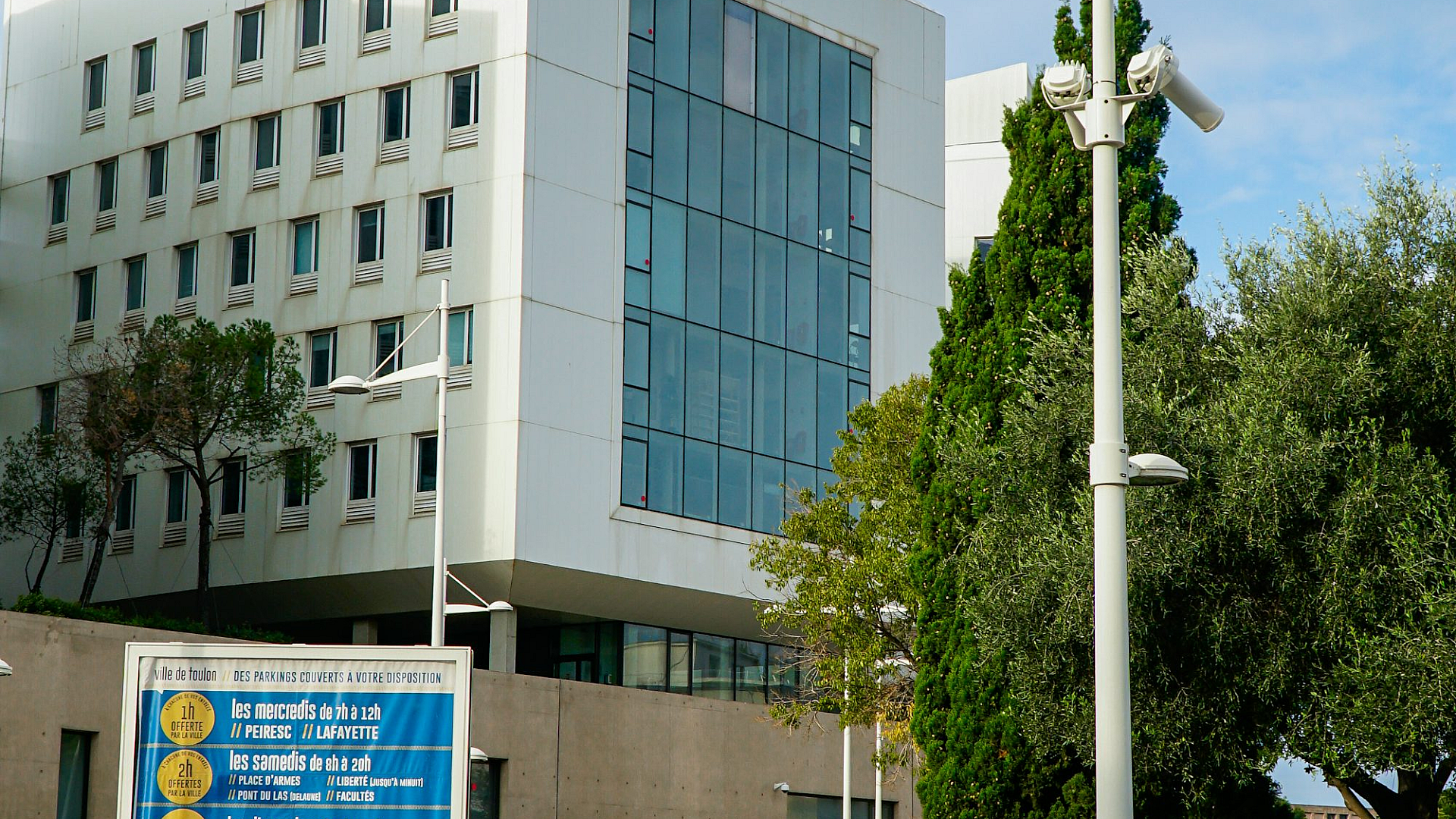 A modern white building with surrounding greenery.