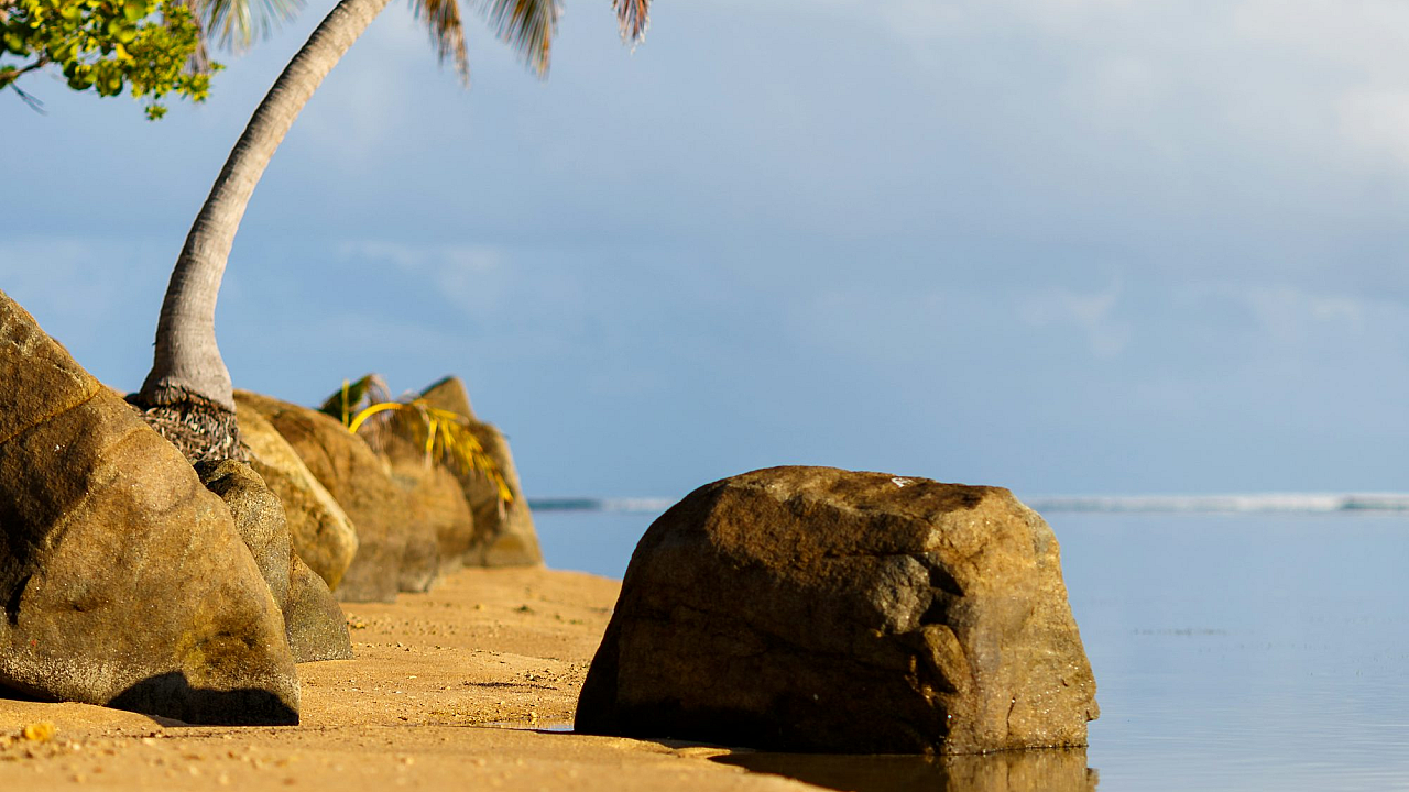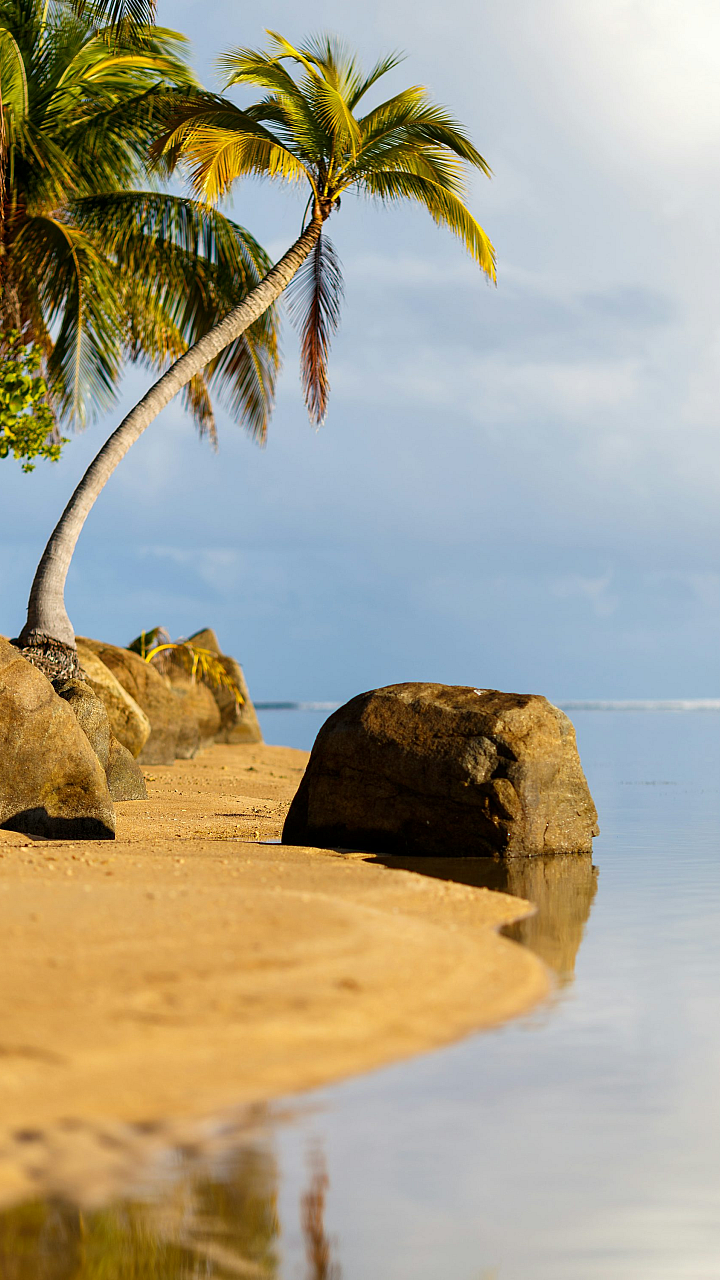 palm tree, beach, rocks, water, ocean, sea, coast, shore, sand, tropical, paradise, nature, landscape, scenery, wallpaper, background, image