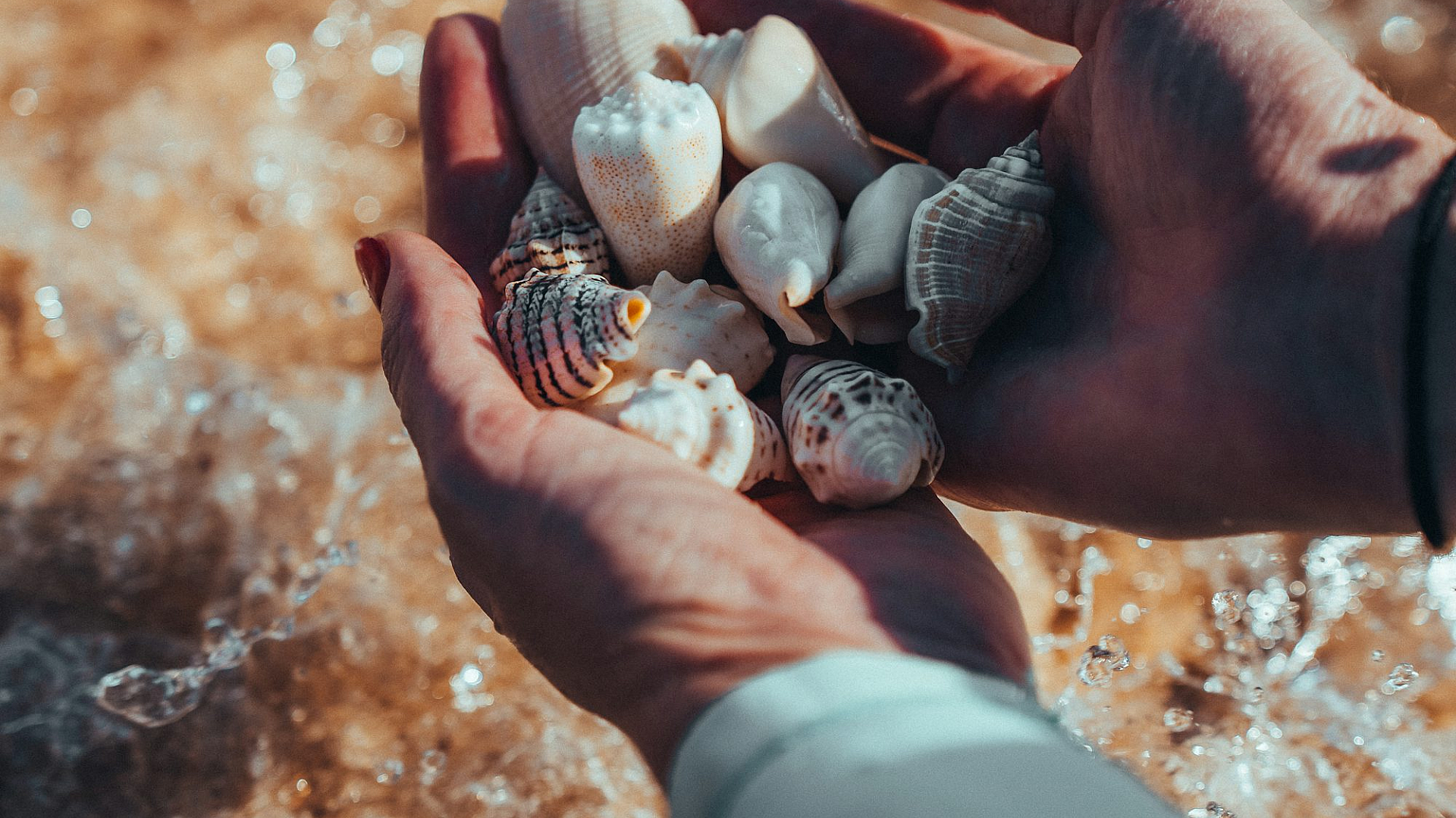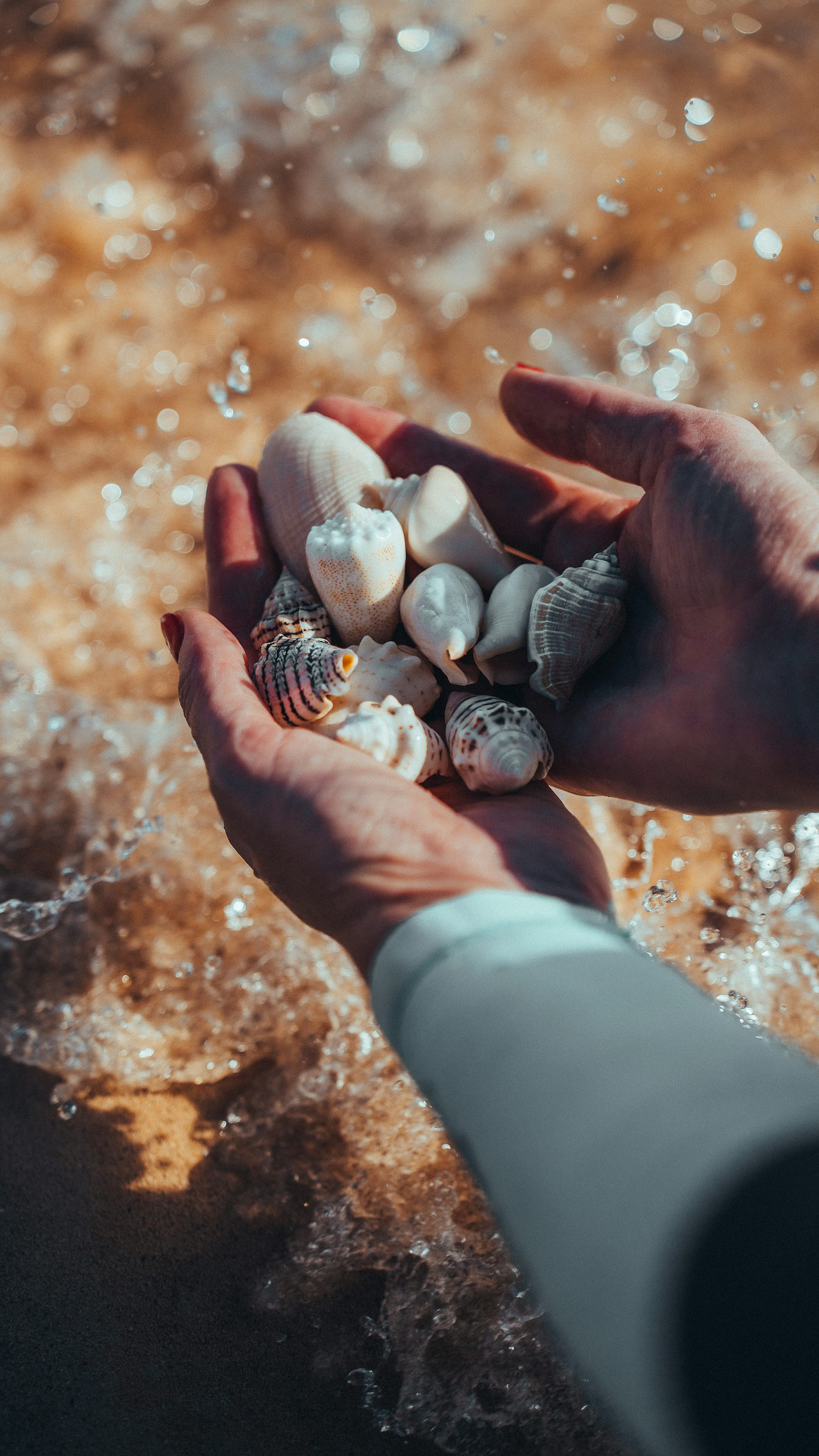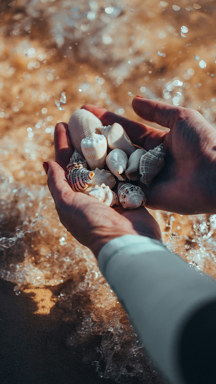 shells, seashells, shellfish, handful, hands, palm, person, human, individual, beach, ocean, sea, coast, nature, coastal, marine