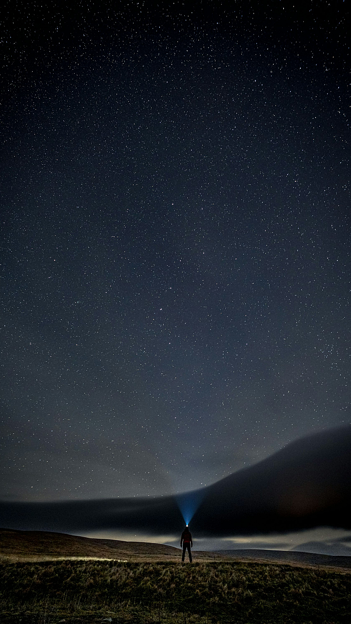 Keywords: person, standing, field, night, sky, stars, starry night, landscape, nature, outdoor, alone, solitude, dark, night sky, celestial