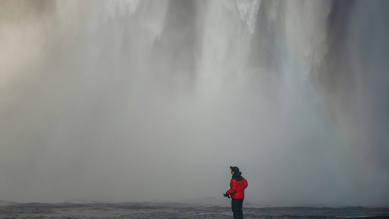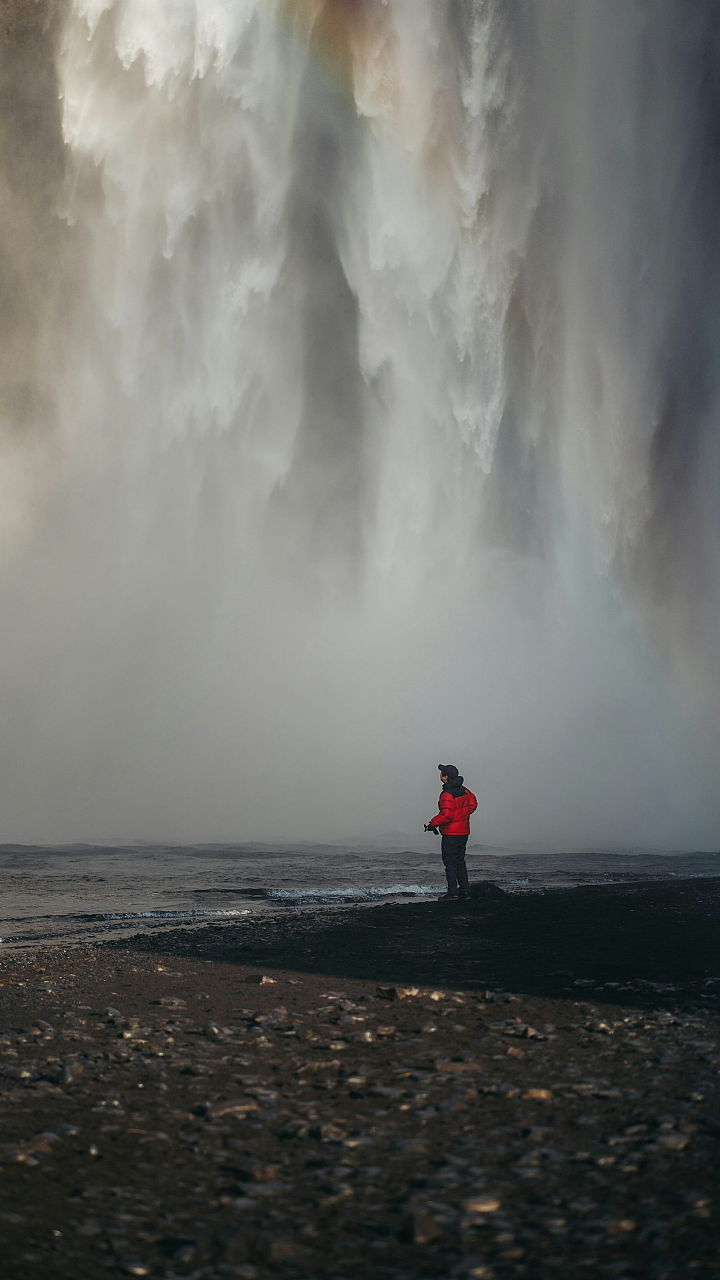 waterfall, waterfalls, cascading water, person, human, individual, figure, standing, pose, posture, large, immense, massive, nature, landscape, scenery