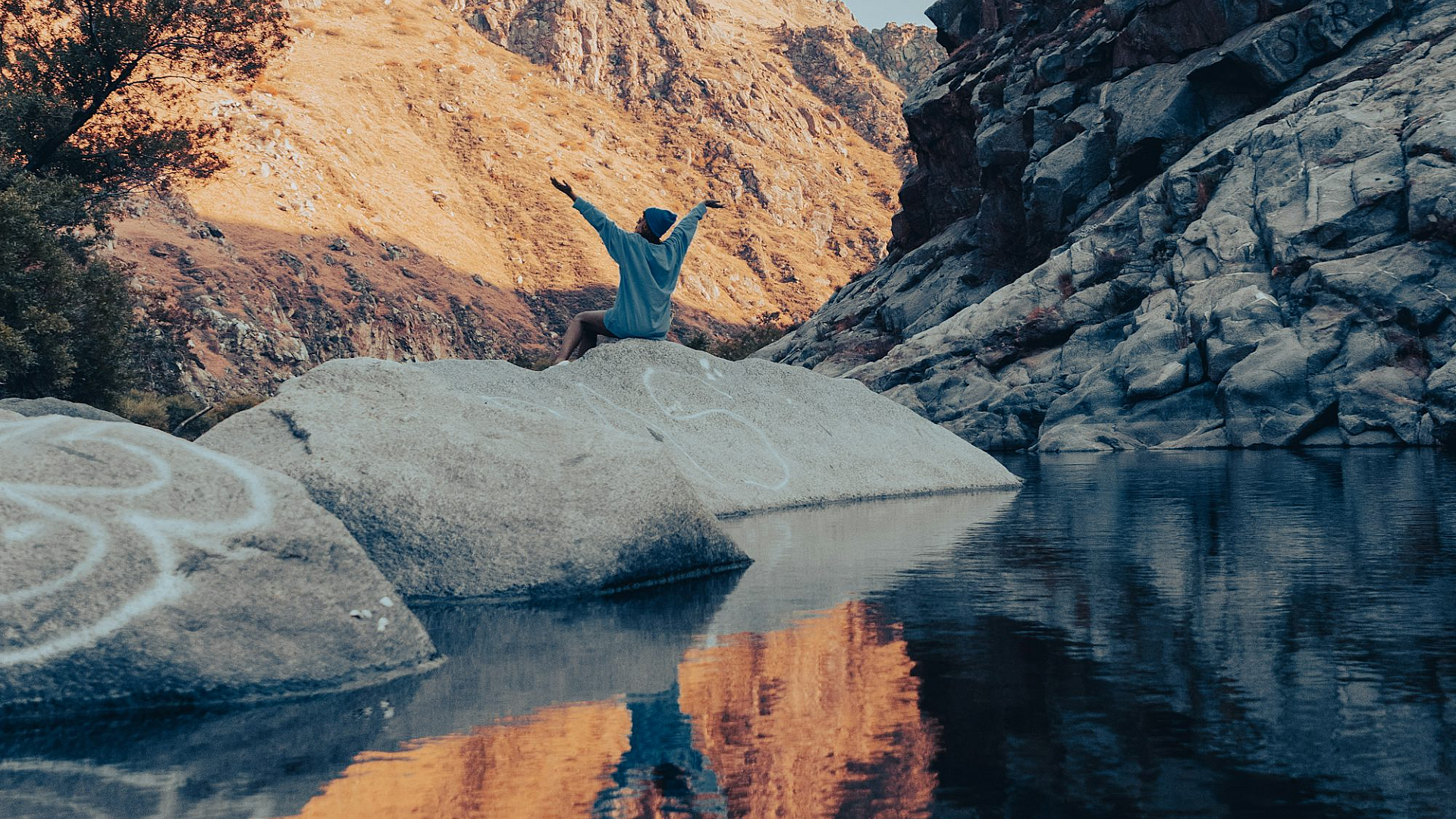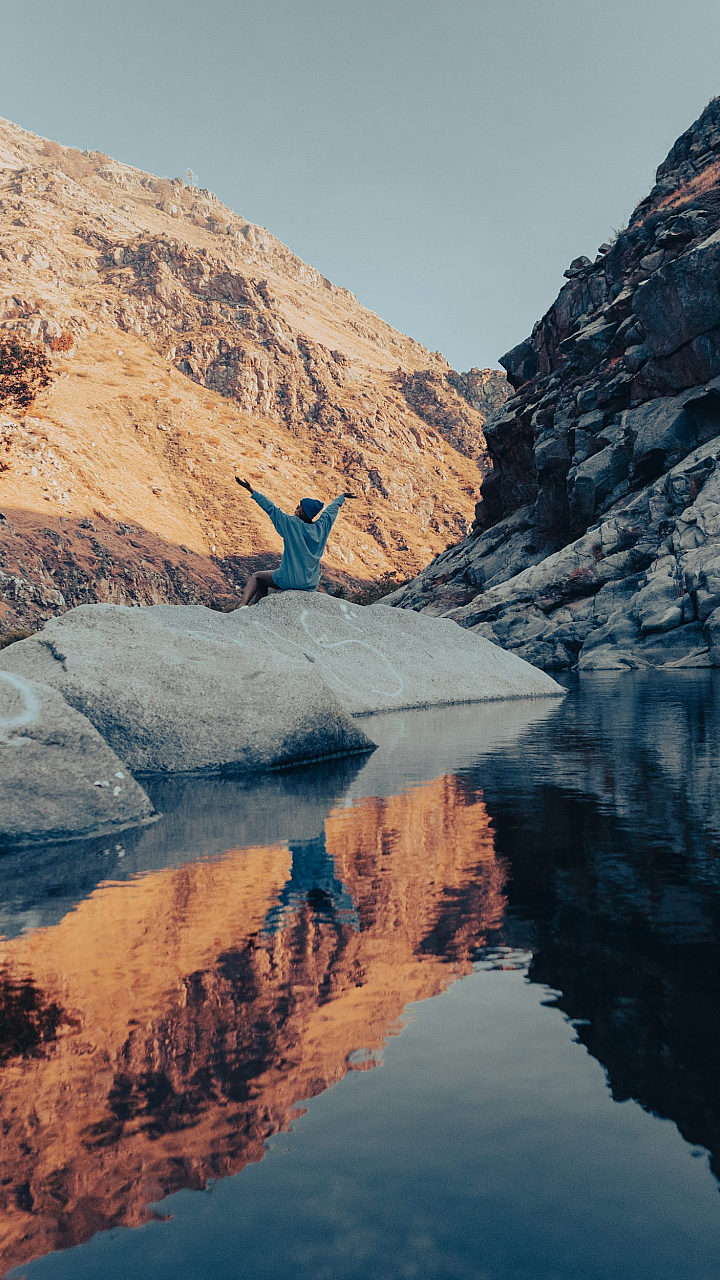 This wallpaper features a person standing on a rock near a body of water. The image evokes a sense of serenity and contemplation, showcasing the beauty of nature and the solitude of the human figure against a vast natural backdrop. The composition of the image likely emphasizes the contrast between the individual and the expansive landscape.