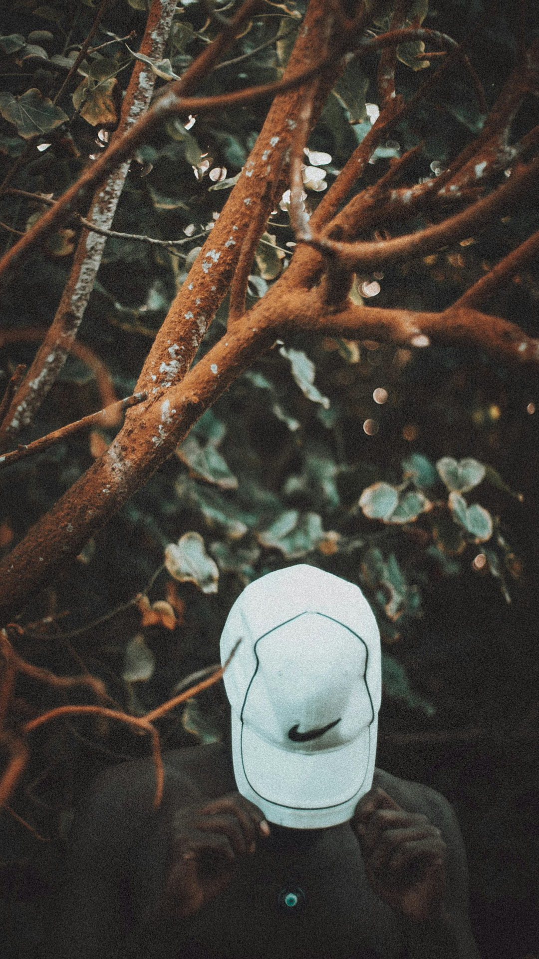 Keywords: person, white hat, tree, nature, outdoors, standing, portrait, scenery, landscape, background, wallpaper, image, photo, human, individual
