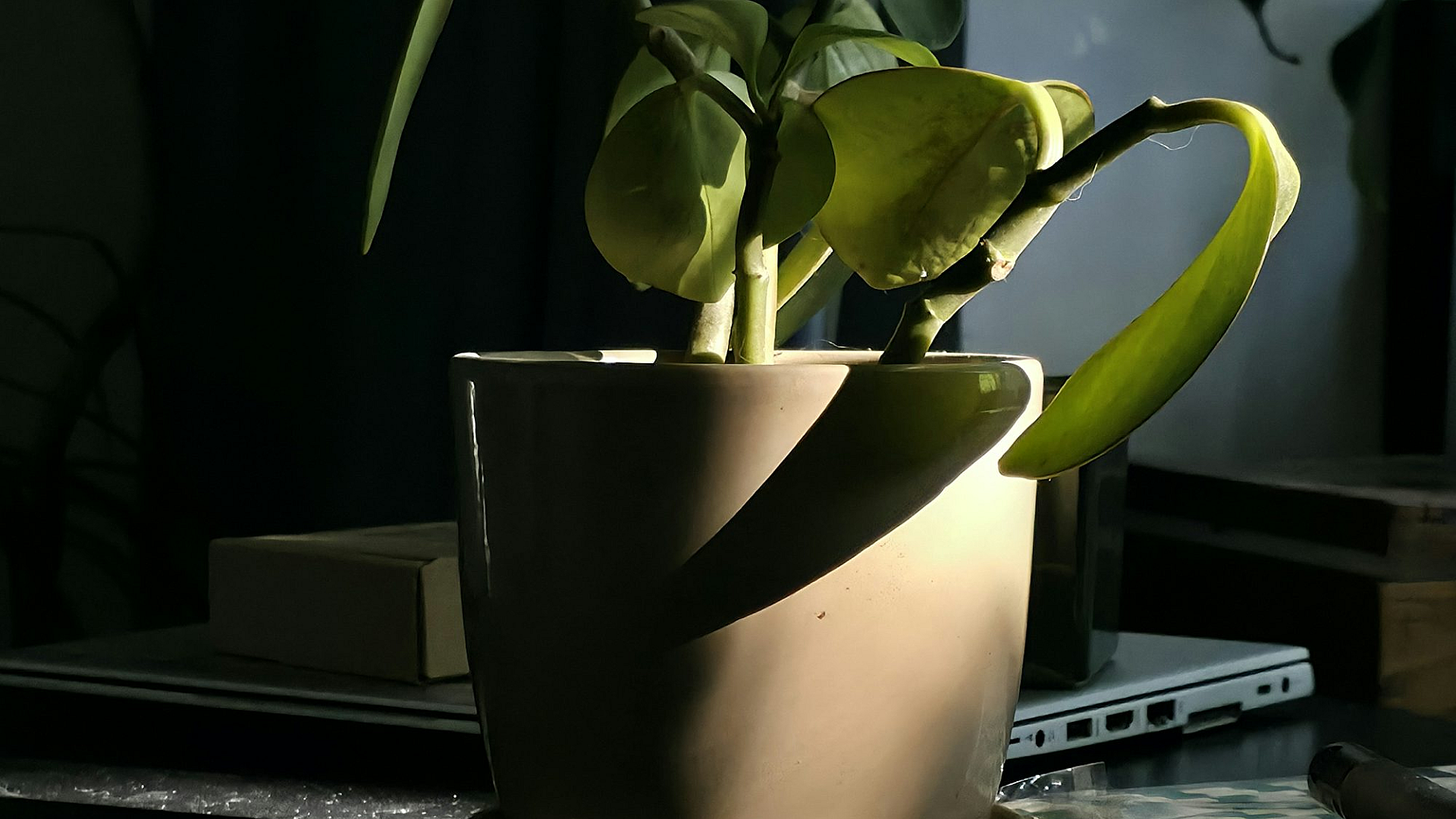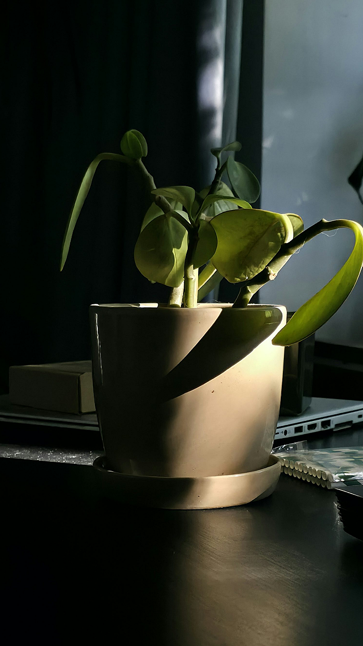 potted plant, plant, sunlight, sun, basking, warmth, light, green, foliage, flora, vegetation, indoor plant, houseplant, natural light, peaceful