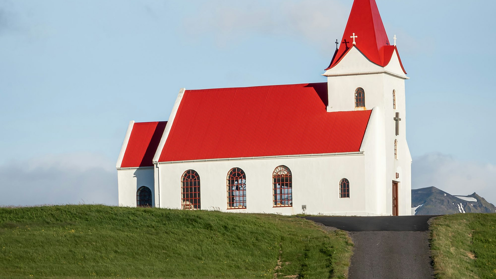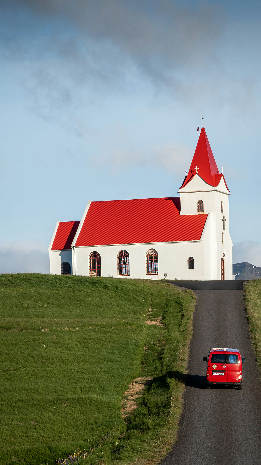 This wallpaper features a captivating scene of a red car speeding down a scenic road, with a pristine white church standing majestically in the background. The contrast between the vibrant red of the car and the pure white of the church creates a visually striking image. The setting appears to be rural, with a peaceful and idyllic atmosphere. The overall mood is one of serene movement and timeless beauty. The image would be perfect for desktops, phones, or any device needing a calming yet engaging background.