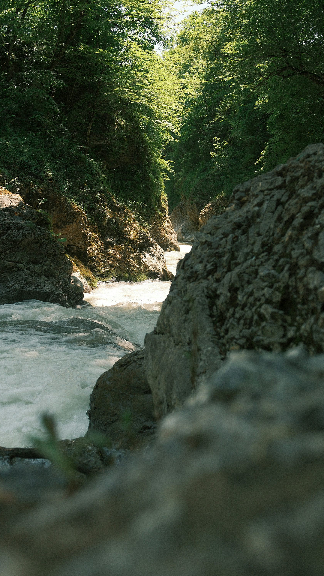 A river rapids flowing through a forest canyon.