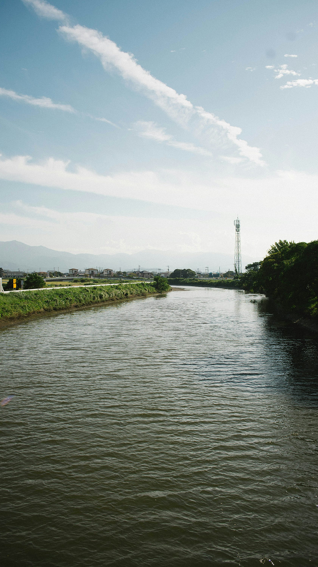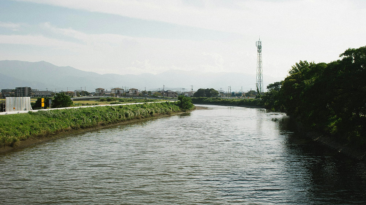 A river running through a lush green countryside