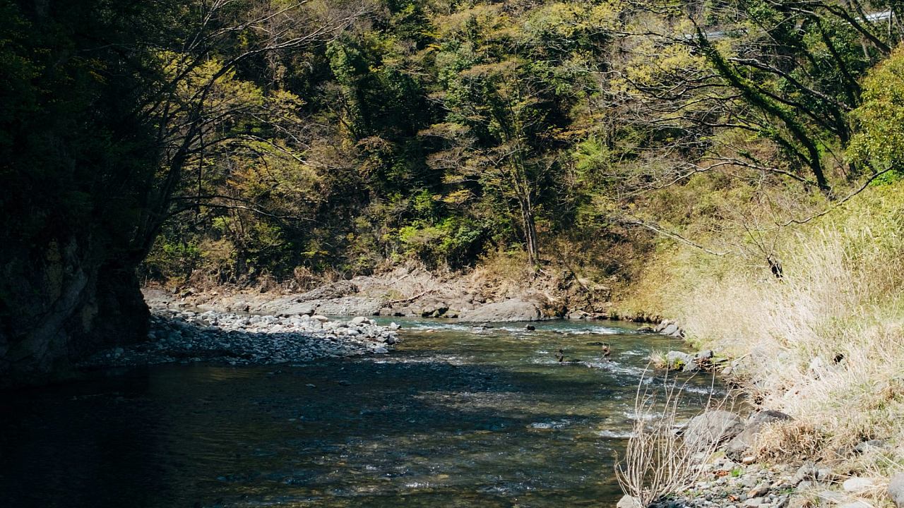 This wallpaper features a serene river scene, showcasing the natural beauty of a flowing river surrounded by lush trees and various sizes of rocks. The image captures the tranquil atmosphere of nature, perfect for a calming desktop or mobile background.