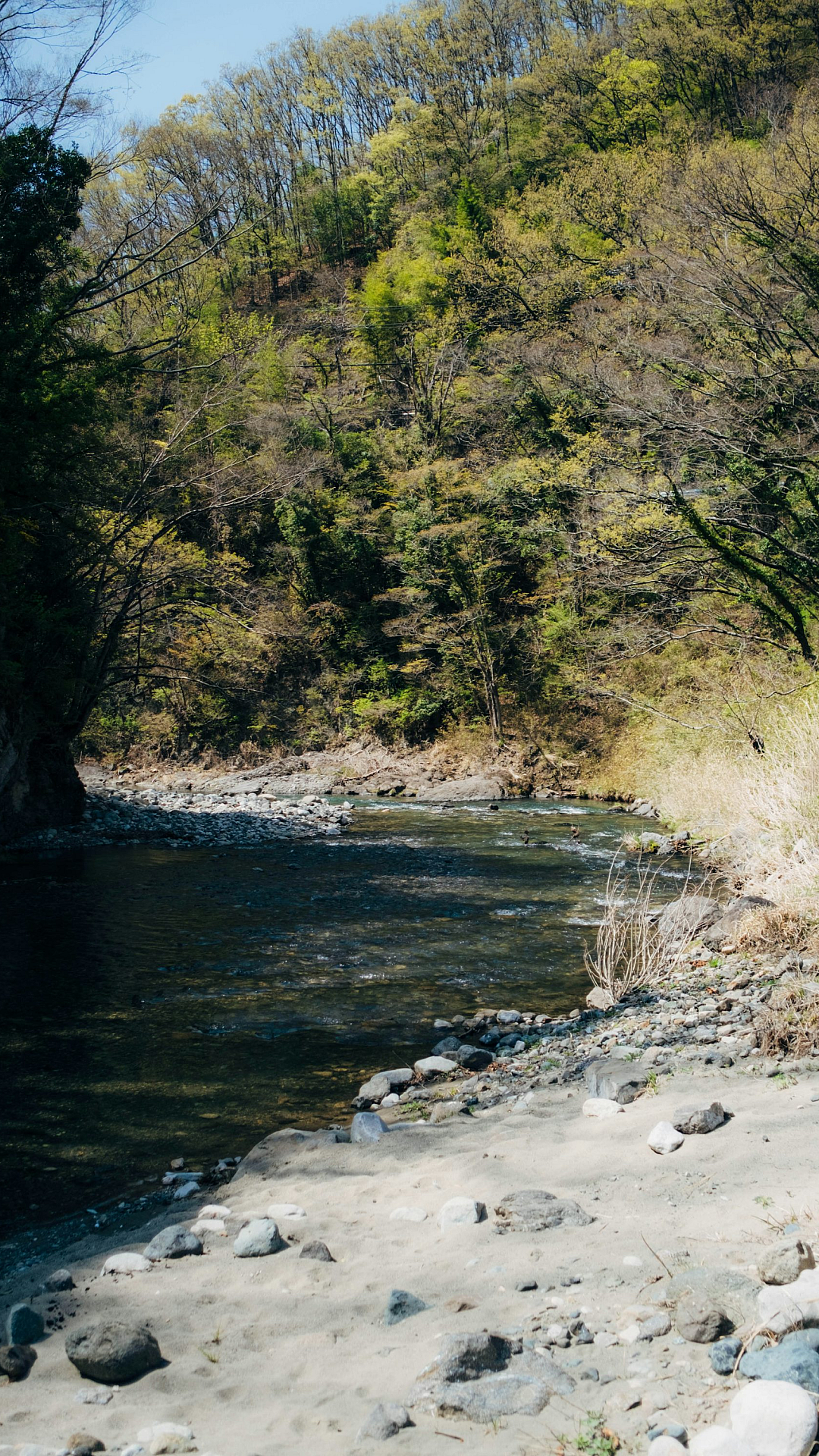 The detailed depiction of the rocks, from smooth pebbles to larger boulders, adds texture and visual interest. The trees lining the river banks provide a sense of depth and serenity, while the flowing water creates a sense of movement and life. The overall color palette is natural and earthy, making it a versatile wallpaper choice for various devices and personal styles.