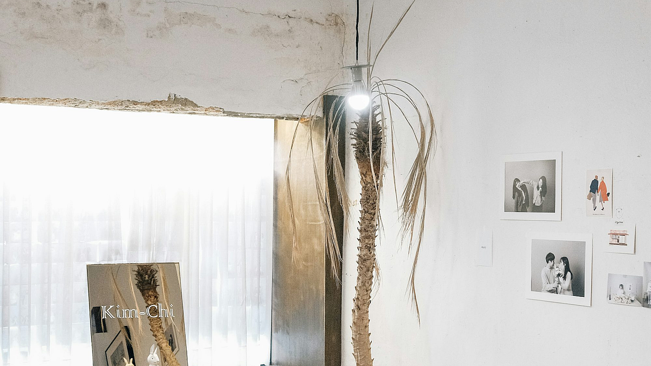 Wallpaper A Room with a Table, Stools, and a Chandelier