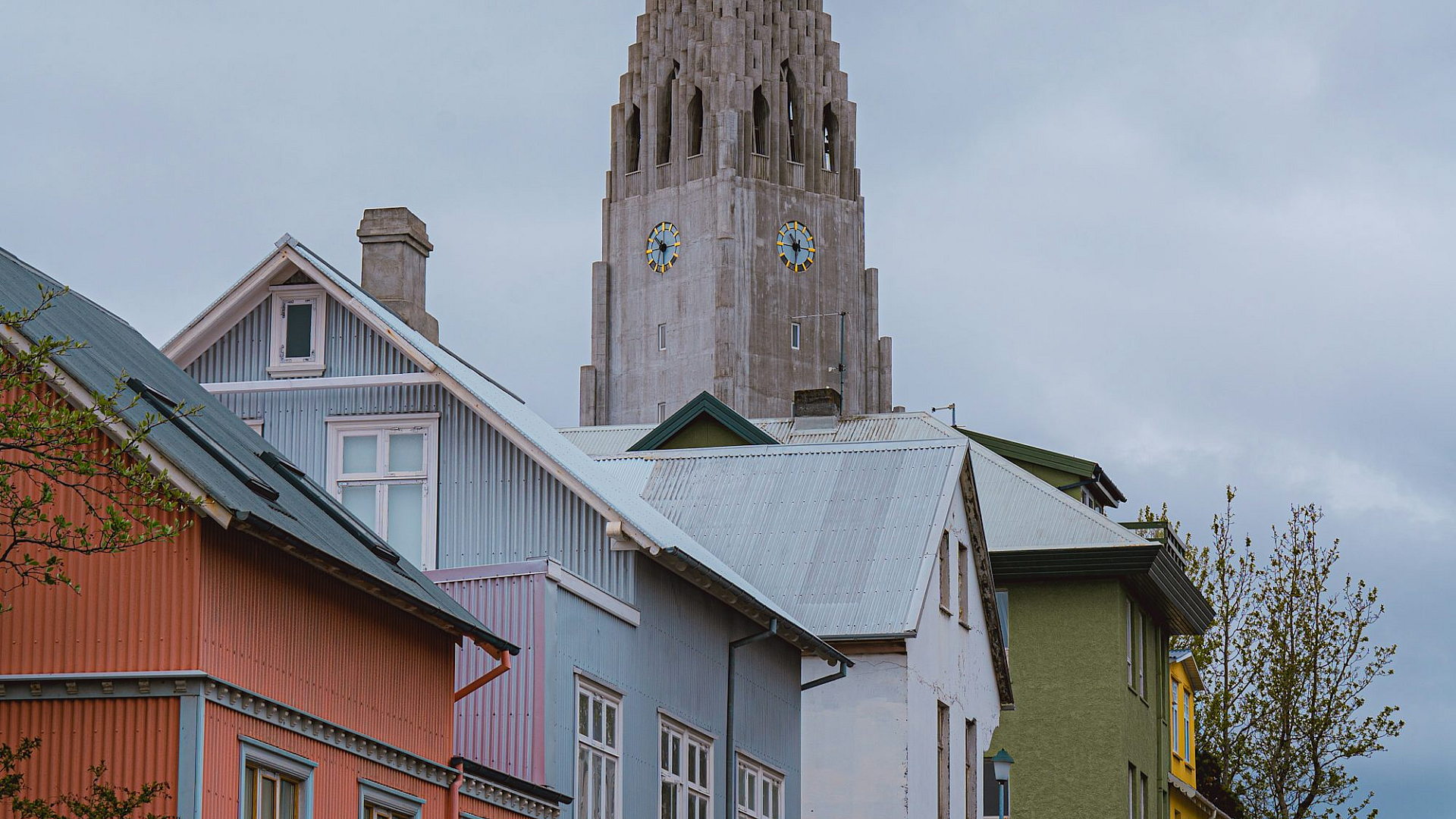 This wallpaper features a picturesque row of houses, their architecture hinting at a quaint village or town setting. In the background, a prominent church steeple rises, adding a touch of pastoral charm to the scene. The image likely evokes feelings of tranquility and community.