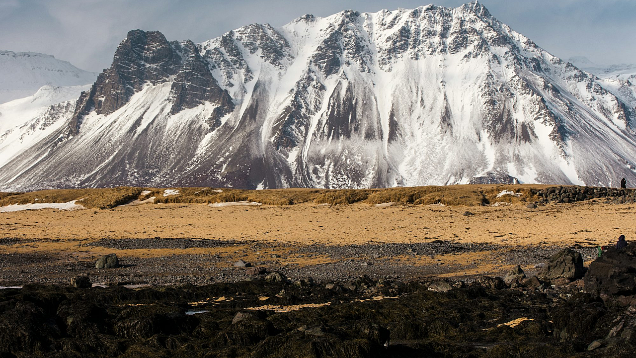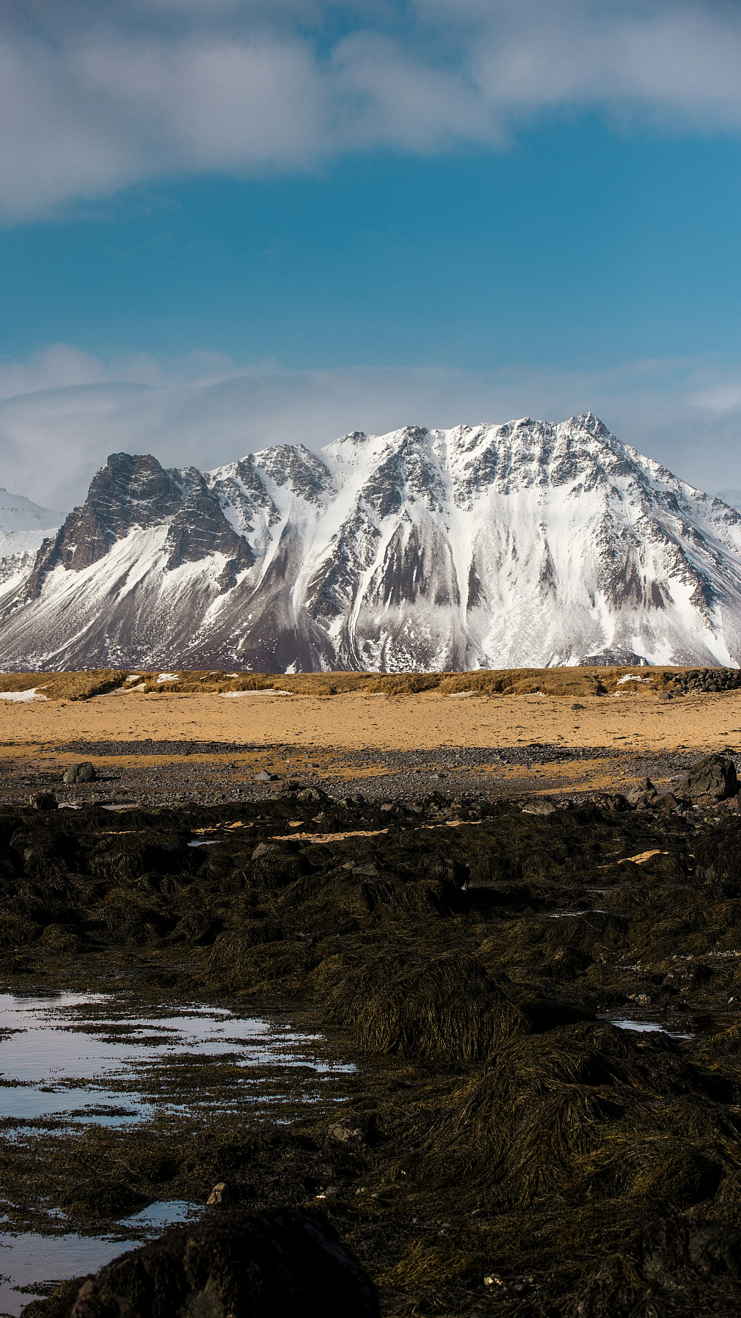 The contrasting textures of the smooth water and the rugged mountain slopes add depth and visual interest to the image. The frozen landscape conveys a sense of stillness and peace, making it an ideal choice for those seeking a visually calming and inspiring wallpaper.
