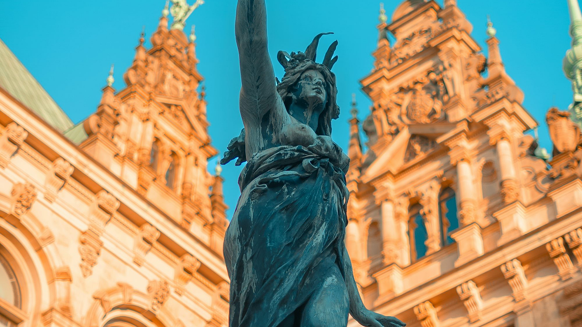 This wallpaper features a striking image of a statue, possibly representing a historical figure or allegorical concept, holding a aloft a torch. The statue stands proudly in front of a grand building, suggesting a significant location of historical or cultural importance. The scene might be set at night, with the torch’s light illuminating the statue and parts of the building, creating a dramatic and atmospheric effect.