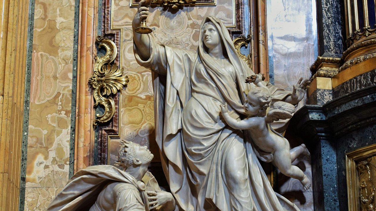 Wallpaper A Statue of a Woman and Two Men in a Church