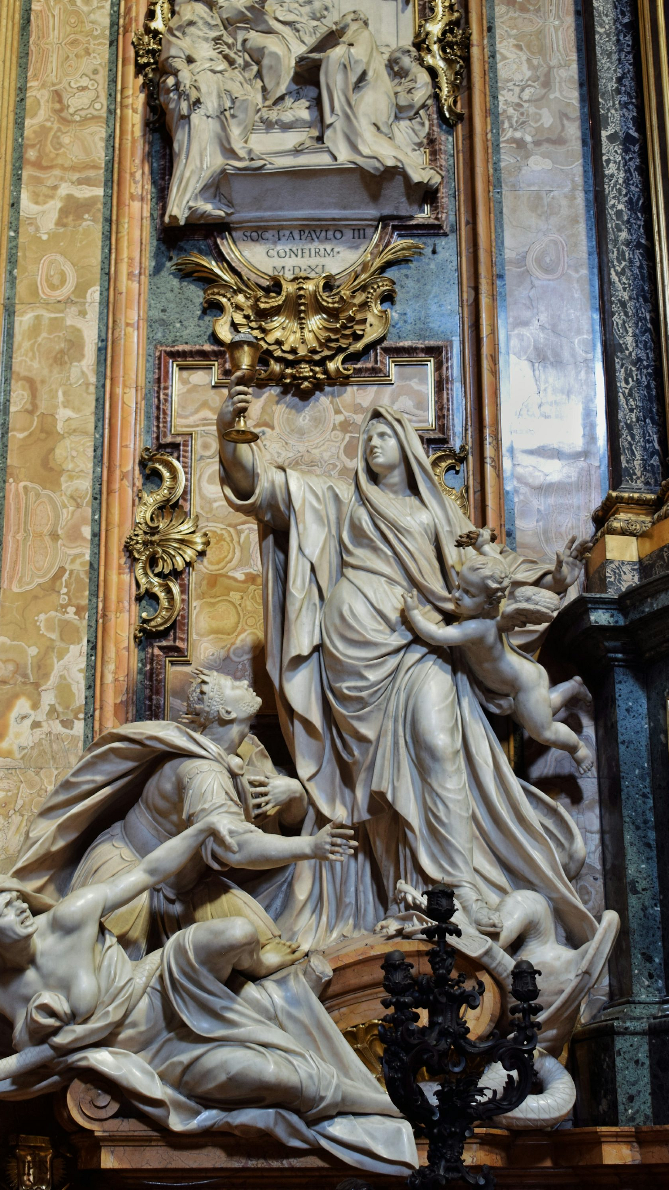 A statue of a woman and two men in a church