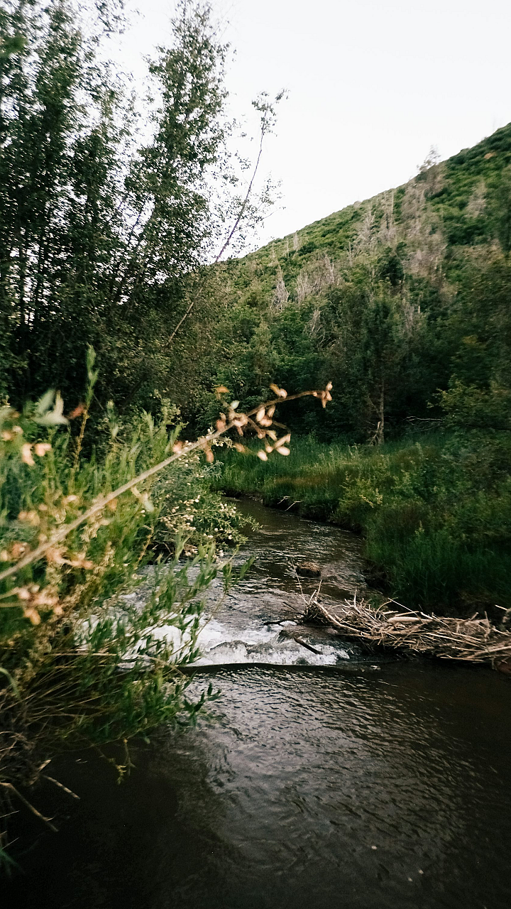 stream, creek, brook, riverlet, watercourse, lush, green, hillside, hills, mountains, landscape, scenery, nature, environment, flowing water