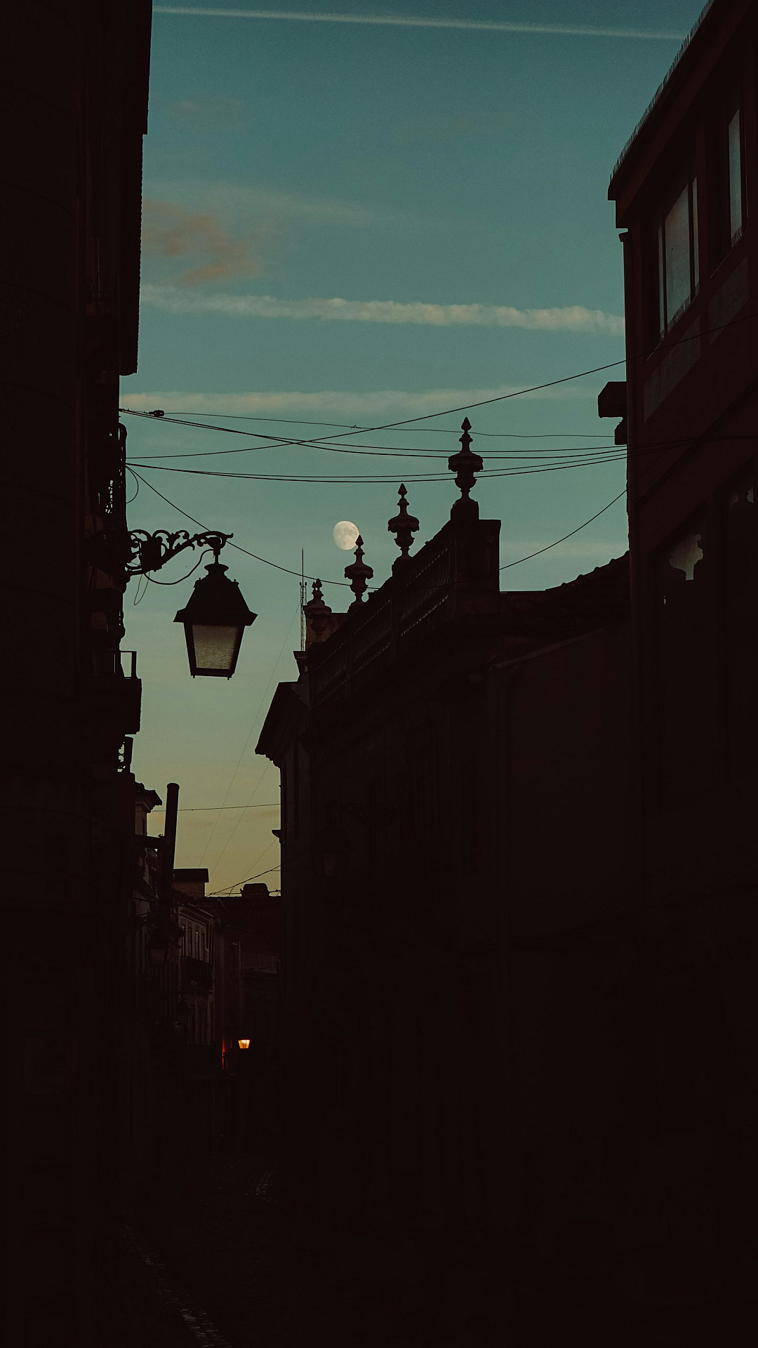 street light, streetlamp, lamppost, building, sidewalk, urban, city, night, evening, illumination, lighting, architecture, exterior, hanging, dark