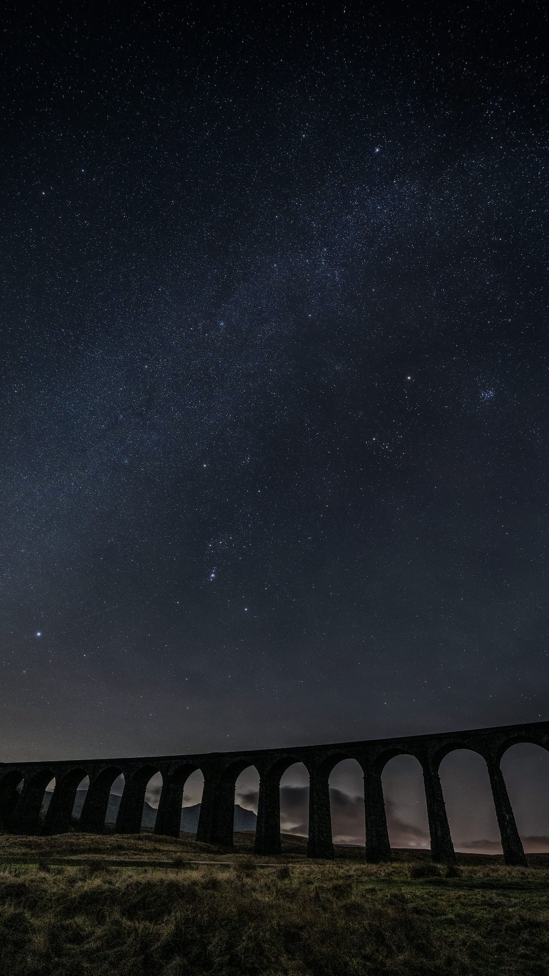 train, bridge, night sky, stars, moon, railway, transportation, travel, landscape, scenery, nighttime, dark, rails, viaduct, overpass