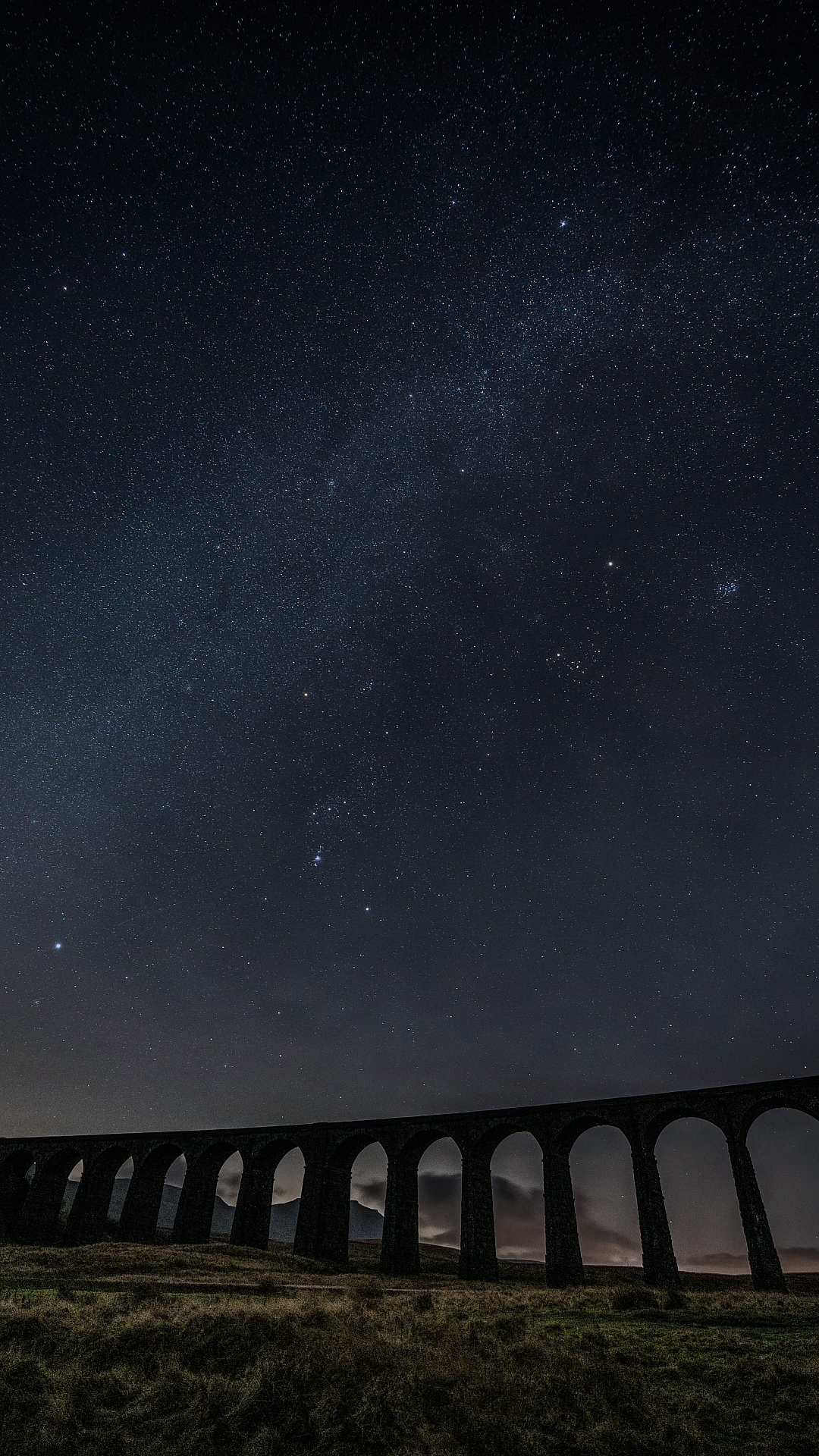The rails leading towards the horizon symbolize the journey and the path ahead. The bridge itself, which might be a viaduct or overpass, adds architectural interest to the composition. The wallpaper is perfect for those who appreciate scenic views, railway themes, and the magic of the night sky.