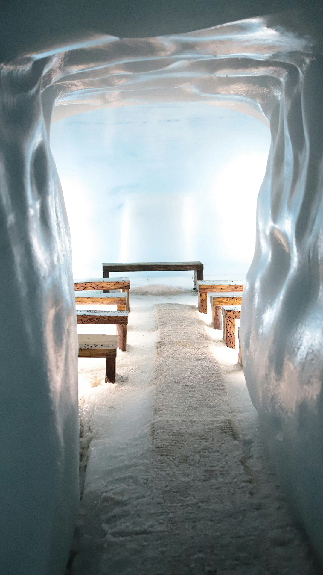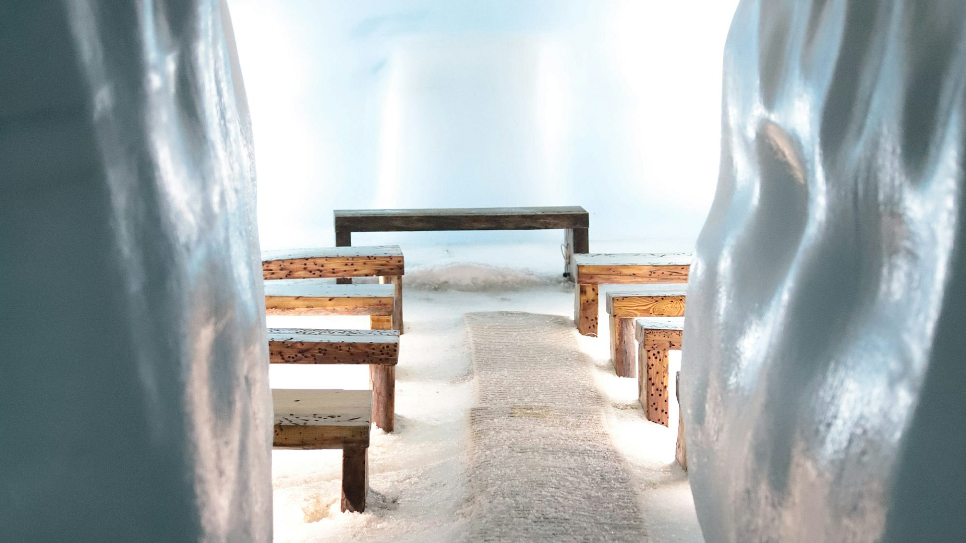 This wallpaper features a serene scene of a snow-covered tunnel with benches lining its sides. The snow on the ground is pristine and undisturbed, giving the image a peaceful and quiet atmosphere. The benches add a touch of human presence, suggesting a place of rest or contemplation. The overall tone is calm and inviting, perfect for a desktop or mobile background.