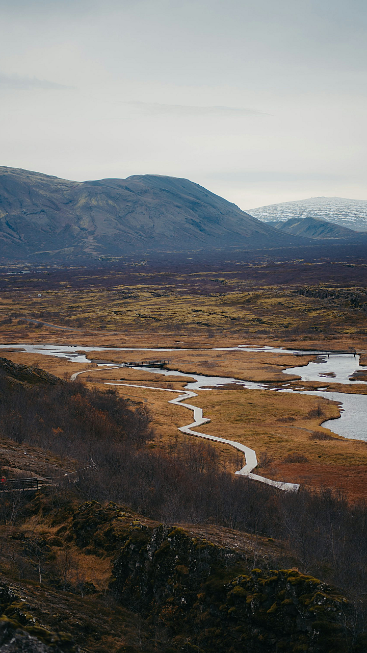 This stunning wallpaper features a breathtaking view of a majestic mountain range, with a serene river gracefully winding its way through the valley below. The image captures the raw beauty of nature, showcasing the powerful scale of the mountains and the tranquil flow of the water. Perfect for desktops, laptops, and mobile devices, this wallpaper offers a captivating escape into the heart of the wilderness.