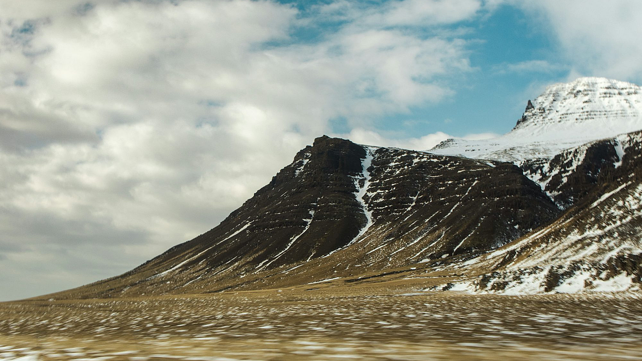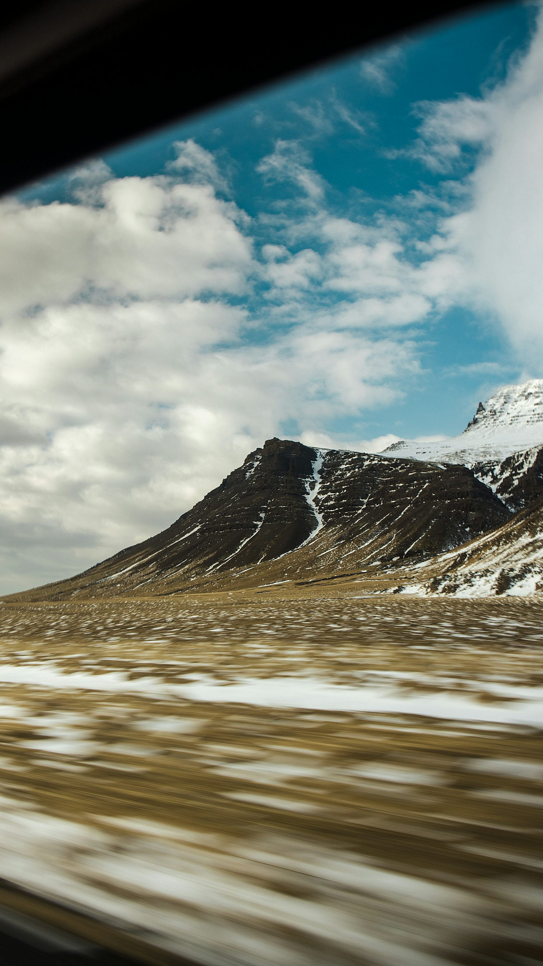 Wallpaper A View of a Snowy Mountain from a Car Window