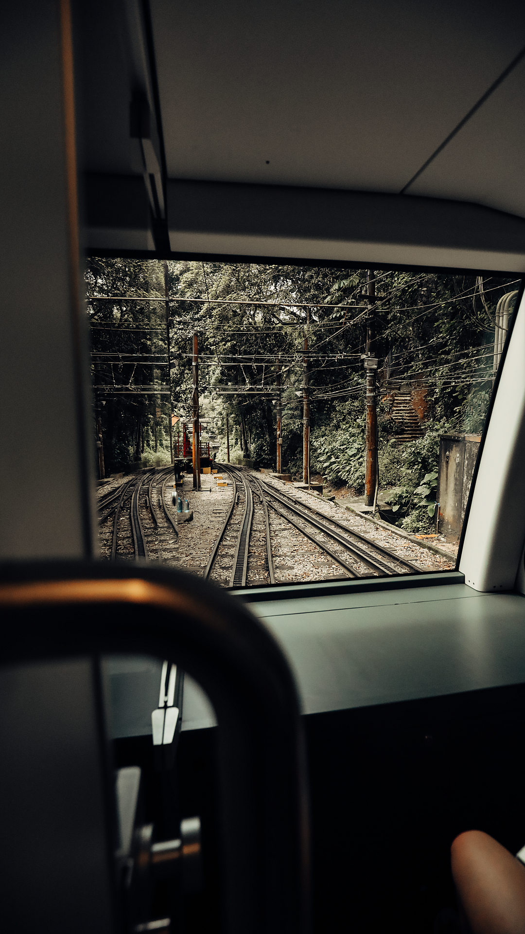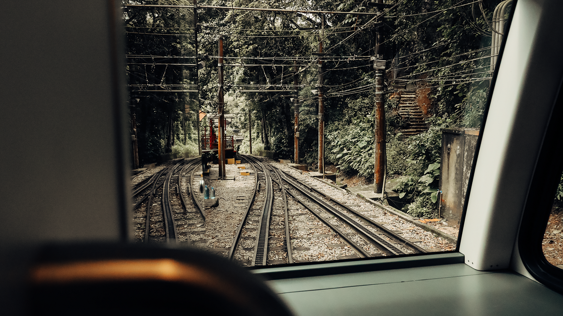This wallpaper features a captivating view of a train track as seen from the inside of a moving vehicle. The perspective offers a unique and intriguing angle on the railway, allowing the viewer to appreciate the lines, curves, and the overall expanse of the track. The image likely captures the feeling of motion and travel, providing a sense of journey and adventure. The color palette and overall composition will depend on the specific image, but generally, such photographs offer a dynamic contrast between the structured lines of the track and the more fluid environment outside.