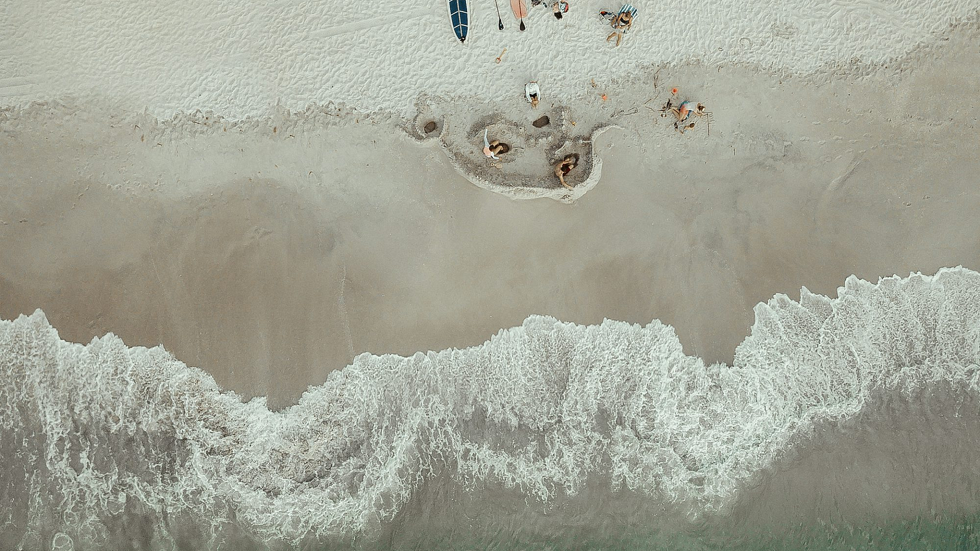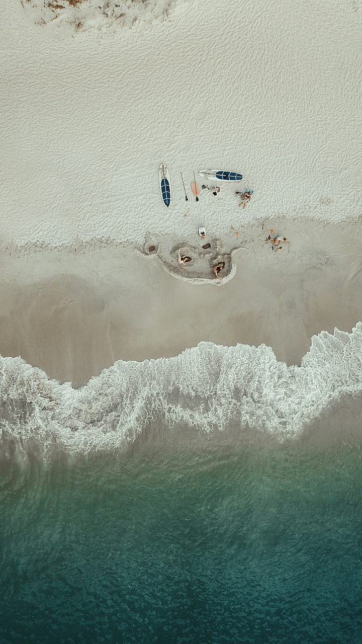 aerial photo, seashore, kayaks, people, beach, coastline, ocean, sea, water, sun, daytime, relaxing, summer, vacation, outdoors