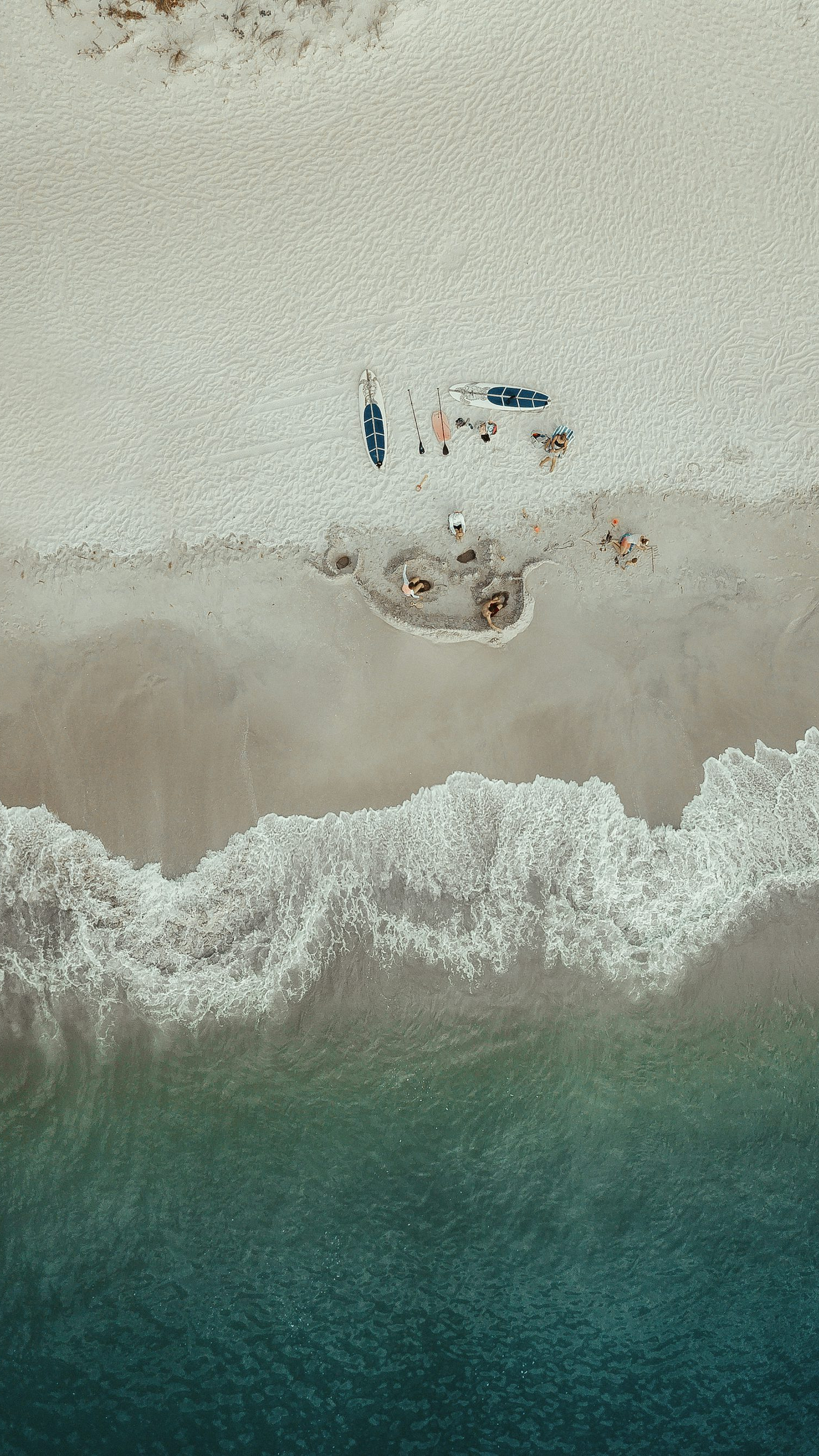 Wallpaper Aerial Photo of People Lying on Seashore Near Kayaks During Daytime