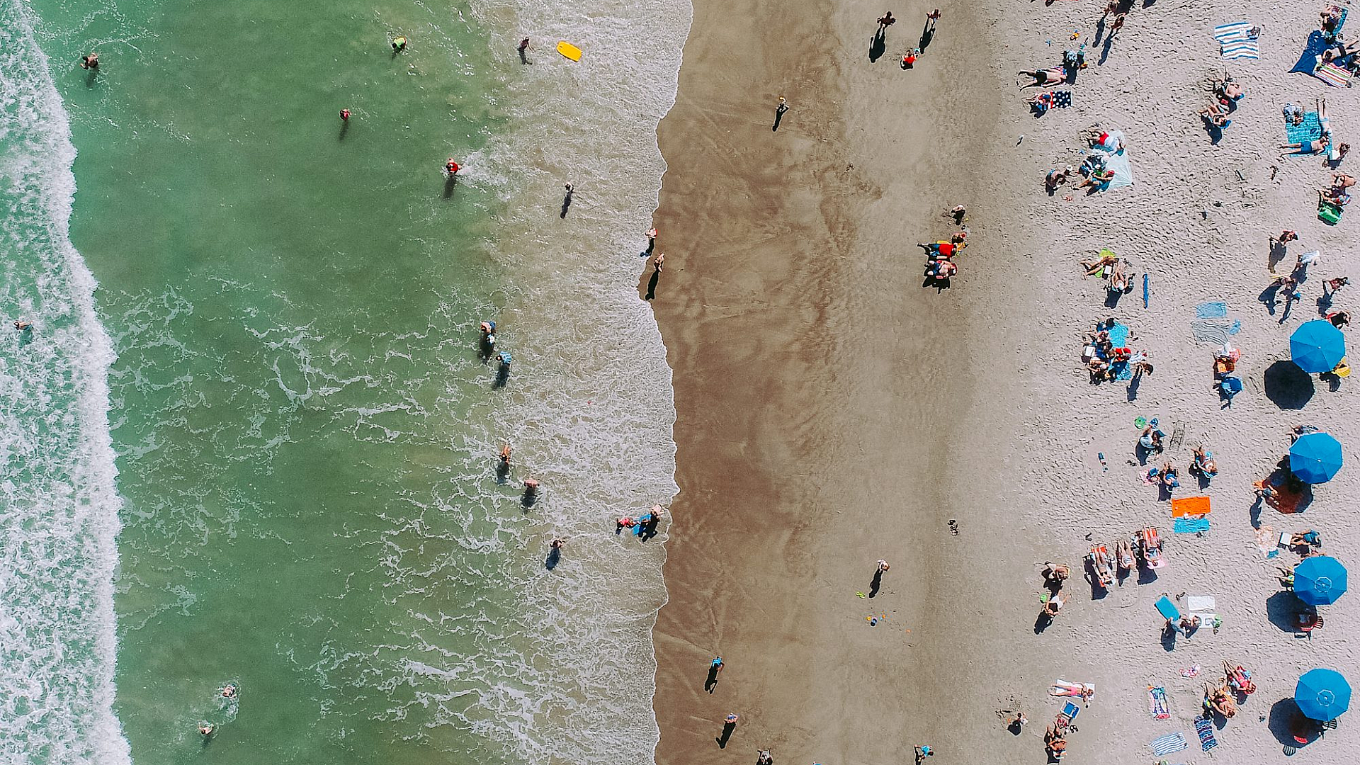 aerial photography, beach, people, ocean, coast, seashore, sand, waves, summer, vacation, holiday, travel, birds-eye view, overhead shot, landscape