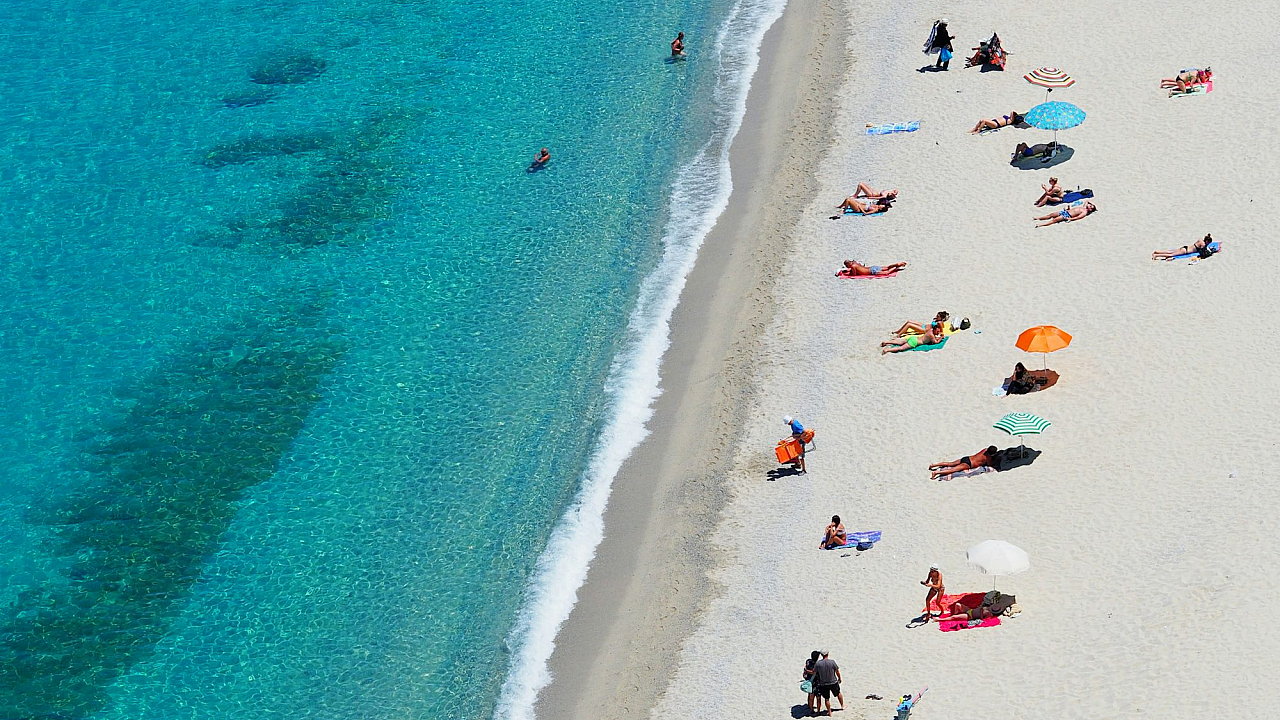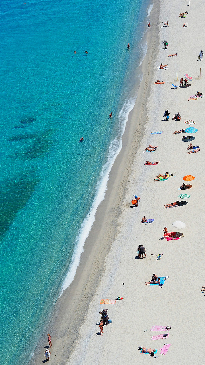 bird’s eye view, aerial view, overhead view, beach, ocean, people, summer, vacation, relaxation, holiday, coastline, sand, seashore, sunlight, crowd, tourists
