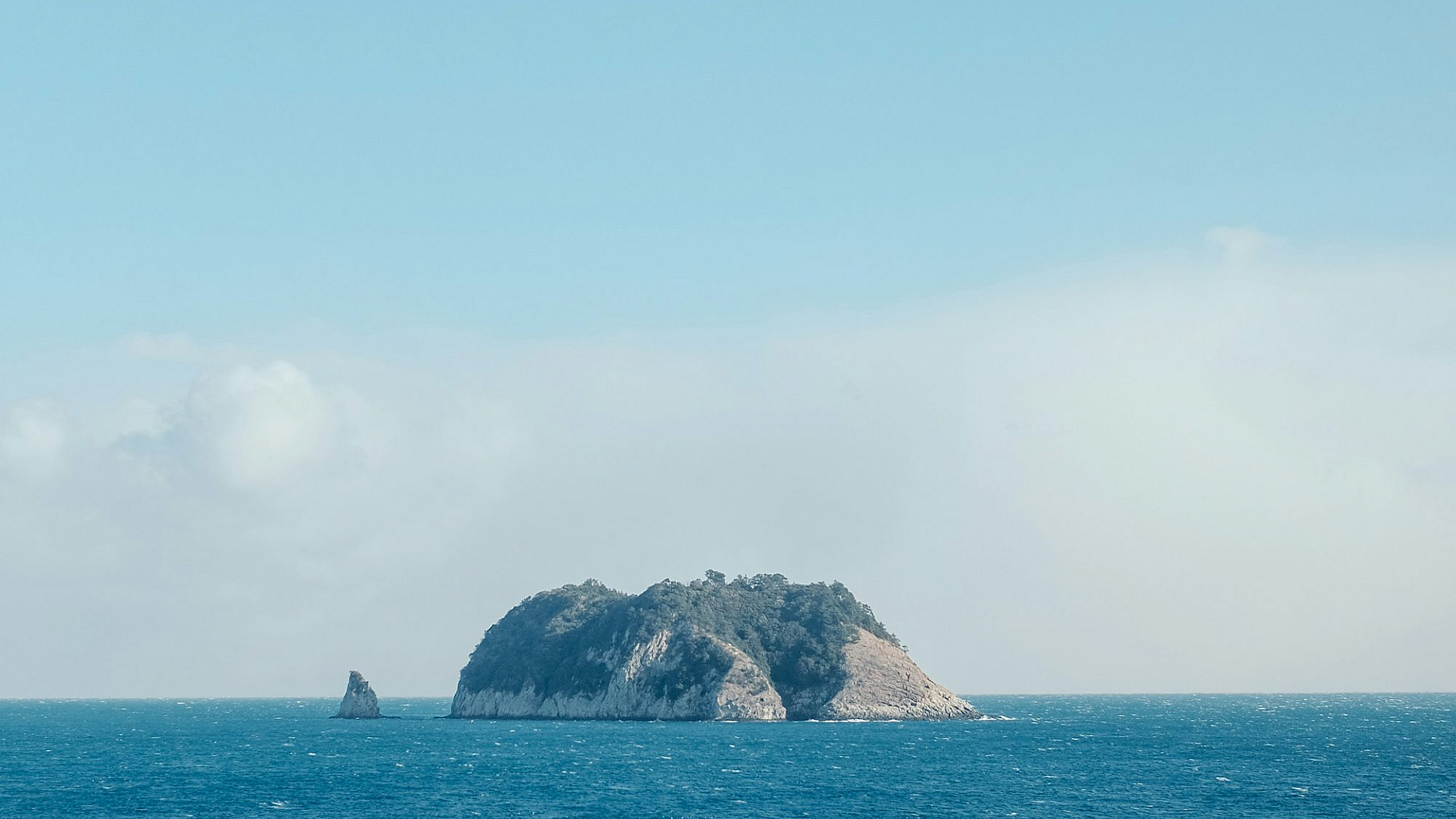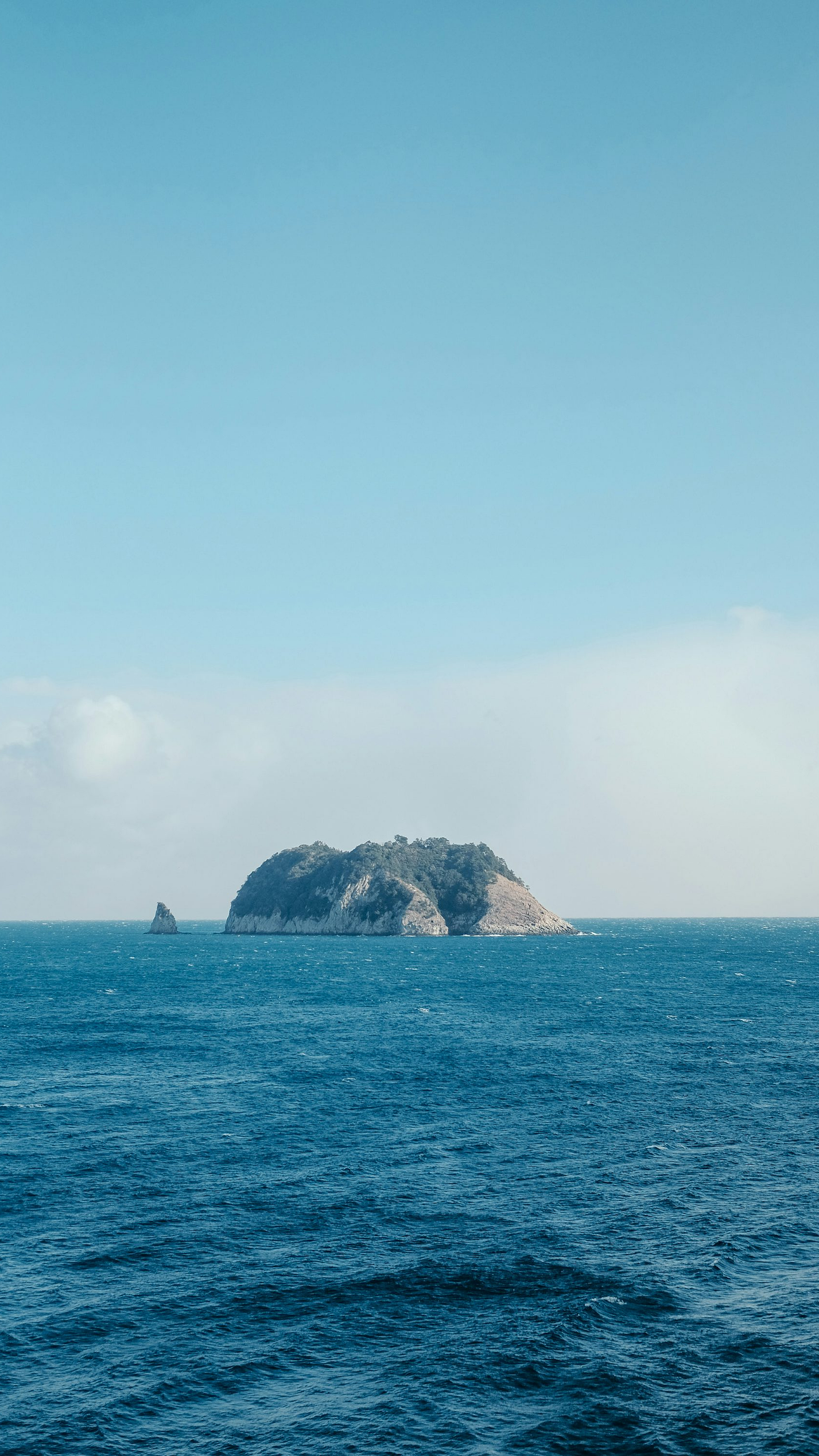 This wallpaper features a stunning black and gray rock formation dramatically rising from the sea under a vibrant blue sky. The image captures the raw beauty of nature, showcasing a powerful contrast between the dark, rugged rocks and the bright, open sky. The coastal setting offers a sense of vastness and tranquility, perfect for those who appreciate landscape photography and natural scenery. The monochrome palette of grays and blacks against the blue provides a striking visual appeal.