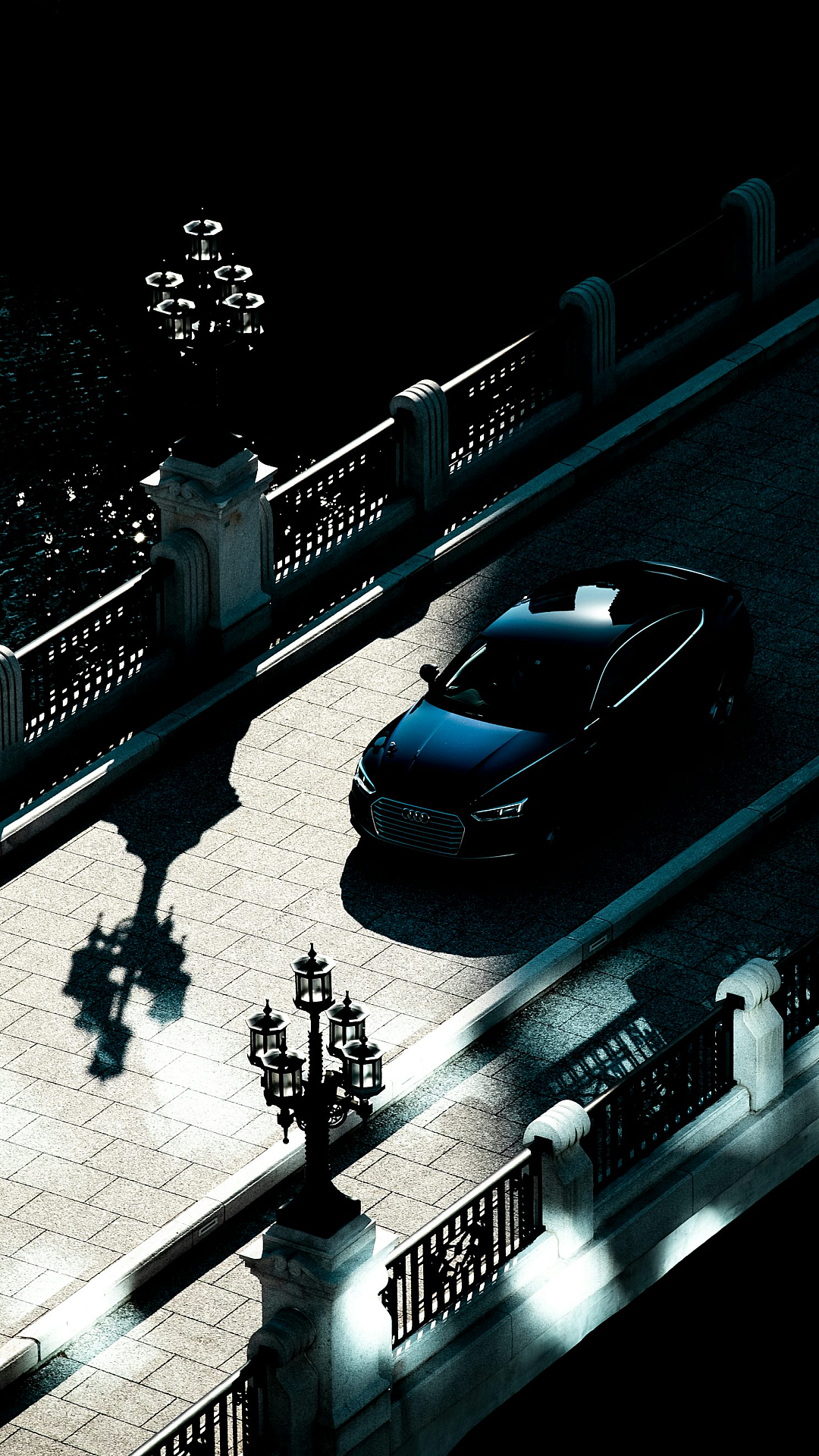 black coupe, black car, night, nighttime, darkness, evening, metal fence, iron fence, parked car, automobile, vehicle, sports car, luxury car, street photography, dark background