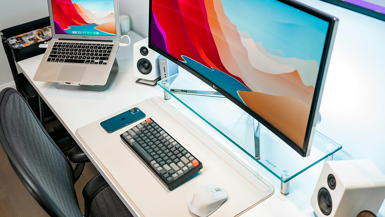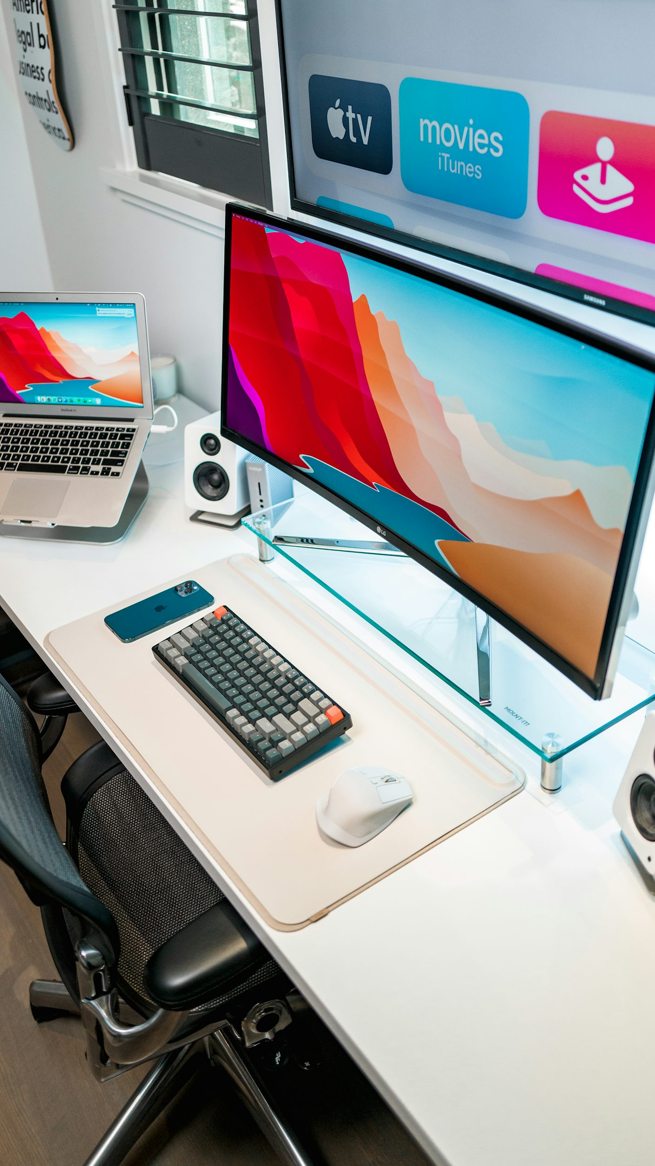 black monitor, flat screen, computer monitor, white table, desktop wallpaper, minimalism, simple background, technology, electronics, screen, display, monitor background, clean aesthetic, modern, office